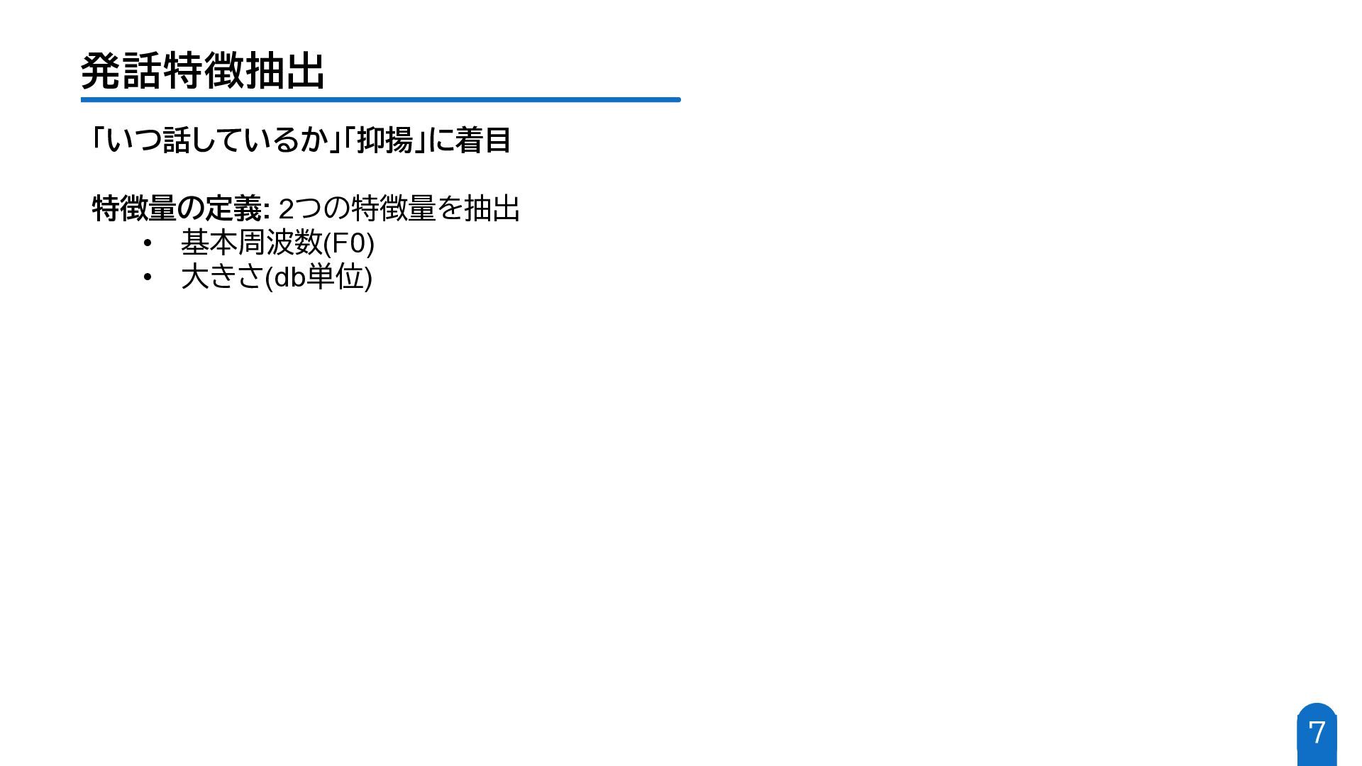 7 発話特徴抽出 「いつ話しているか」「抑揚」に着目 特徴量の定義: 2つの特徴量を抽出 • 基本周波数(F0) • 大きさ(db単位)