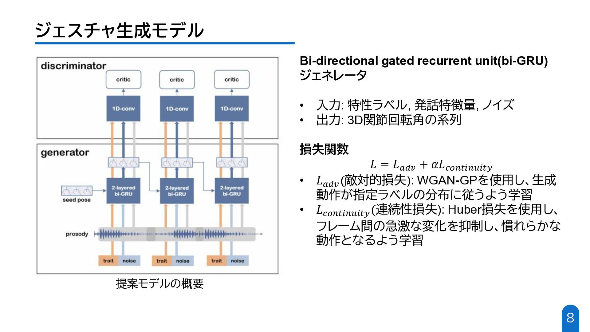 発話特徴量, ノイズ • 出力: 3D関節回転角の系列 損失関数 𝐿 = 𝐿𝑎𝑑𝑣 + 𝛼𝐿𝑐𝑜𝑛𝑡𝑖𝑛𝑢𝑖𝑡𝑦 • 𝐿𝑎𝑑𝑣 (敵対的損失): WGAN-GPを使用し、生成 動作が指定ラベルの分布に従うよう学習 • 𝐿𝑐𝑜𝑛𝑡𝑖𝑛𝑢𝑖𝑡𝑦 (連続性損失): Huber損失を使用し、 フレーム間の急激な変化を抑制し、慣れらかな 動作となるよう学習 提案モデルの概要