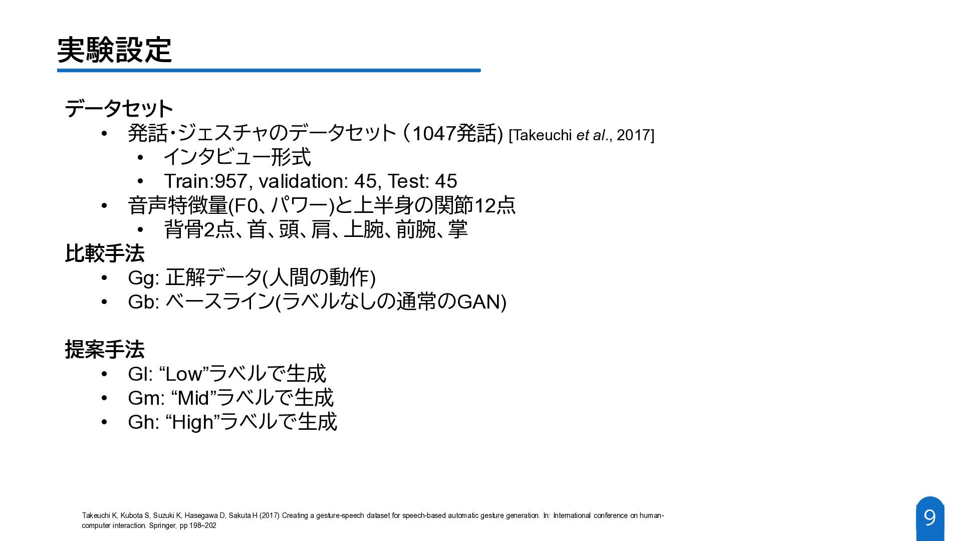 • インタビュー形式 • Train:957, validation: 45, Test: 45 • 音声特徴量(F0、パワー)と上半身の関節12点 • 背骨2点、首、頭、肩、上腕、前腕、掌 比較手法 • Gg: 正解データ(人間の動作) • Gb: ベースライン(ラベルなしの通常のGAN) 提案手法 • Gl: “Low”ラベルで生成 • Gm: “Mid”ラベルで生成 • Gh: “High”ラベルで生成 Takeuchi K, Kubota S, Suzuki K, Hasegawa D, Sakuta H (2017) Creating a gesture-speech dataset for speech-based automatic gesture generation. In: International conference on human- computer interaction. Springer, pp 198–202