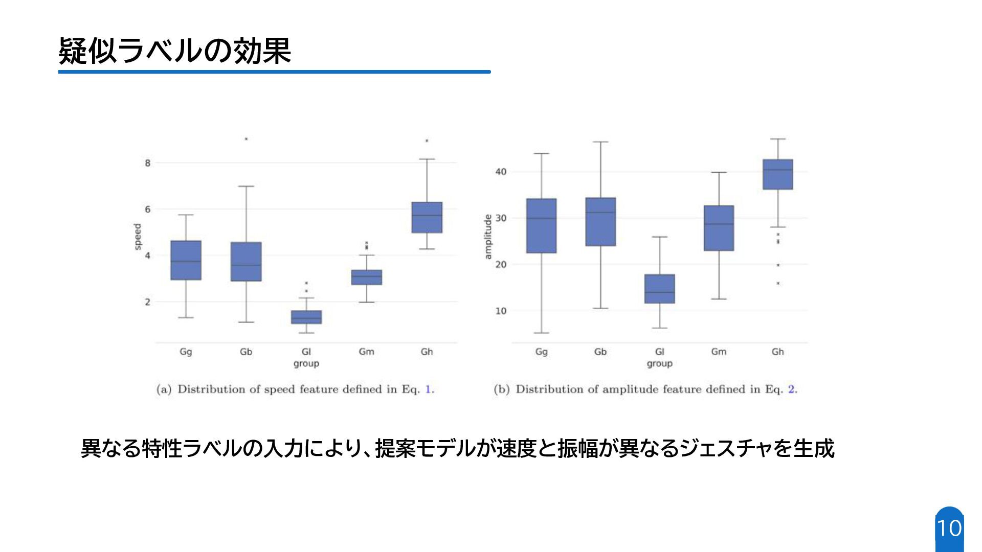 10 疑似ラベルの効果 異なる特性ラベルの入力により、提案モデルが速度と振幅が異なるジェスチャを生成