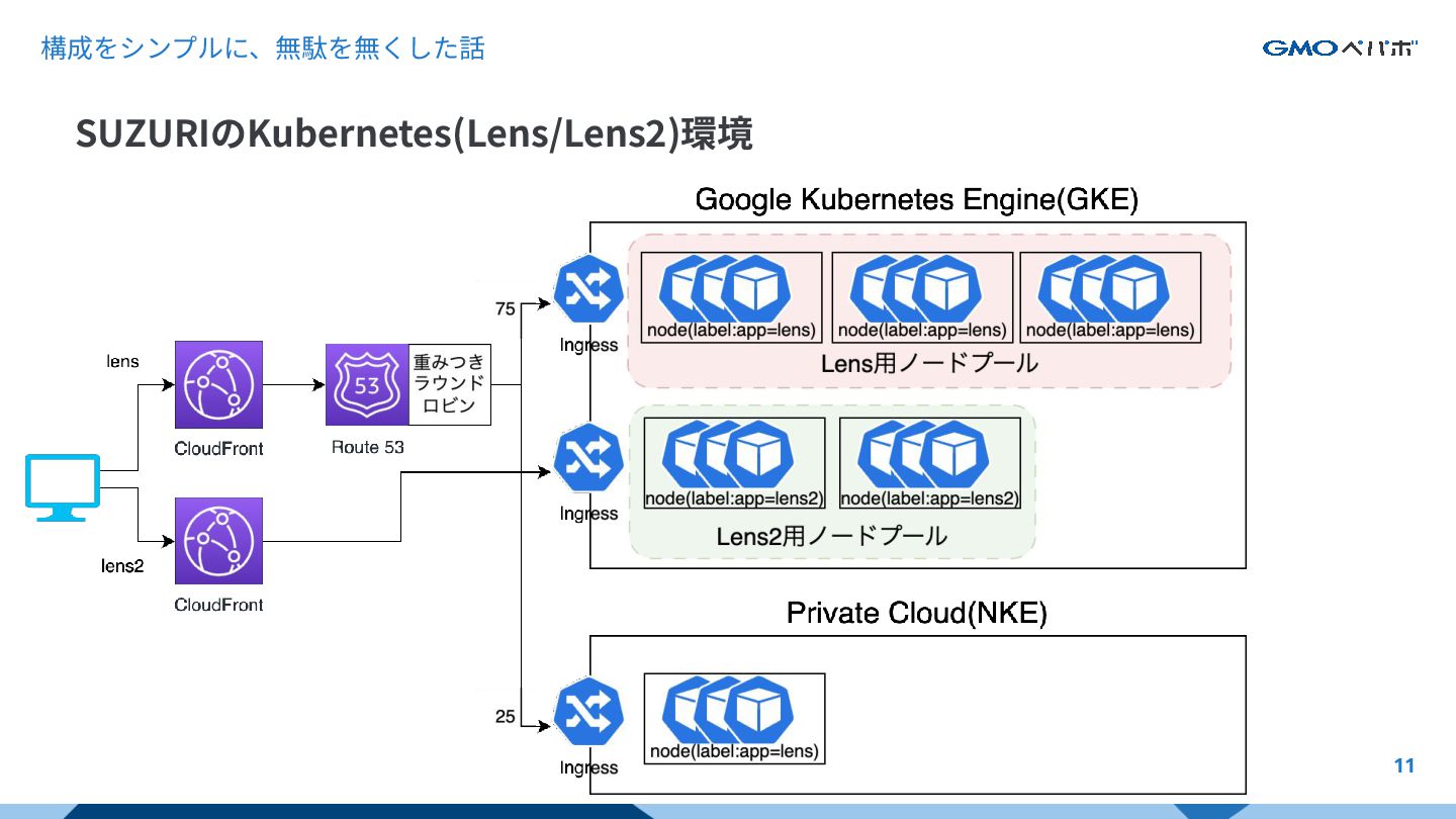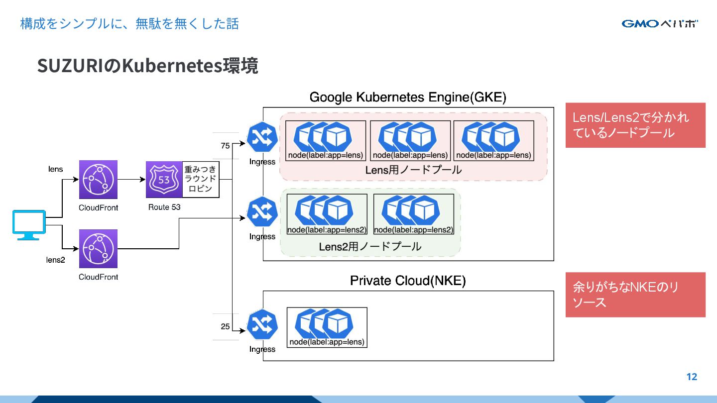 構成をシンプルに、無駄を無くした話 12 SUZURIのKubernetes環境 Lens/Lens2で分かれ ているノードプール 余りがちなNKEのリ ソース