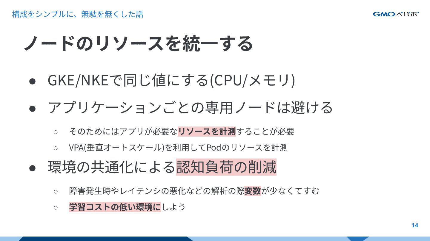 構成をシンプルに、無駄を無くした話 13 シンプルに、効率よく、無駄をなくす GKEのノードプールを Lens/Lens2で統一 GKE/NKEでノードのリ ソースを統一 NKEのノードをスケー ルアウト NKEにリクエストを寄せ