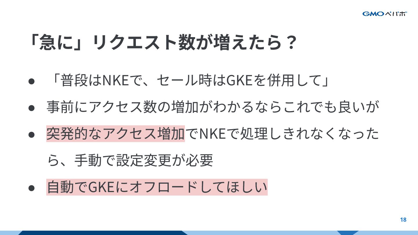 18 • 「普段はNKEで、セール時はGKEを併⽤して」 • 事前にアクセス数の増加がわかるならこれでも良いが • 突発的なアクセス増加でNKEで処理しきれなくなった ら、⼿動で設定変更が必要 • ⾃動でGKEにオフロードしてほしい