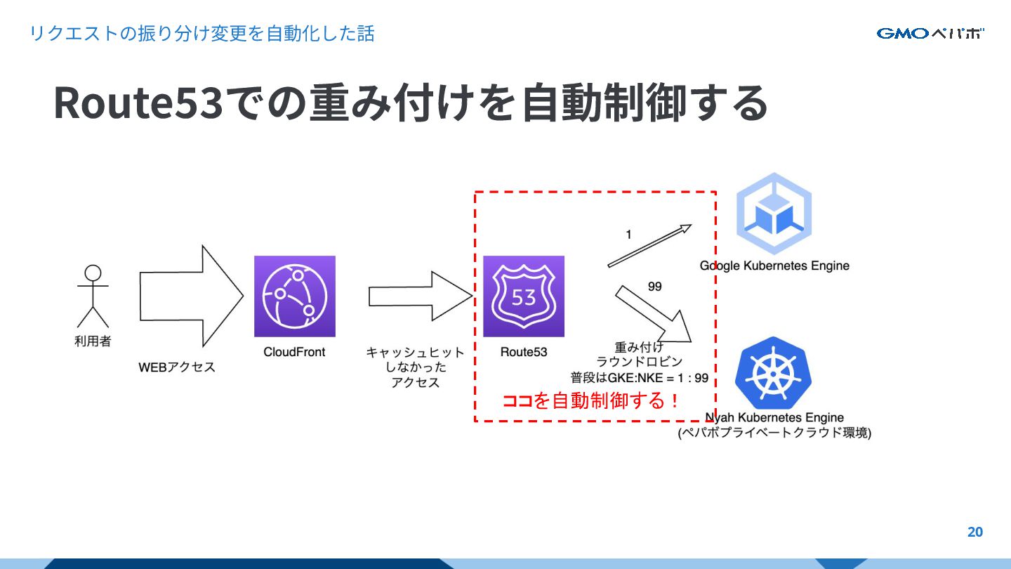 リクエストの振り分け変更を⾃動化した話 20 Route53での重み付けを⾃動制御する ココを自動制御する!