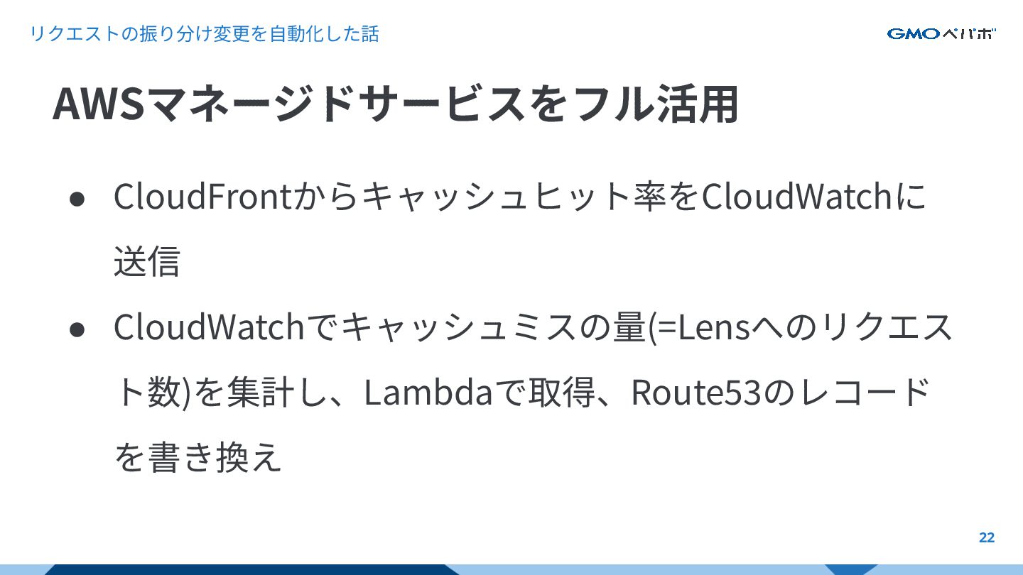 リクエストの振り分け変更を⾃動化した話 22 • CloudFrontからキャッシュヒット率をCloudWatchに 送信 • CloudWatchでキャッシュミスの量(=Lensへのリクエス ト数)を集計し、Lambdaで取得、Route53のレコード を書き換え AWSマネージドサービスをフル活⽤