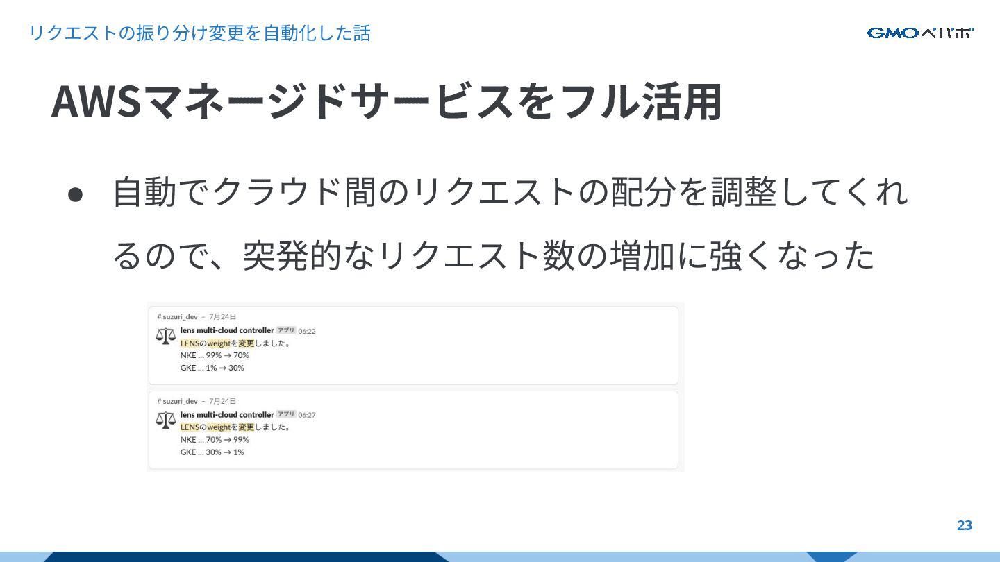 リクエストの振り分け変更を⾃動化した話 23 • ⾃動でクラウド間のリクエストの配分を調整してくれ るので、突発的なリクエスト数の増加に強くなった AWSマネージドサービスをフル活⽤