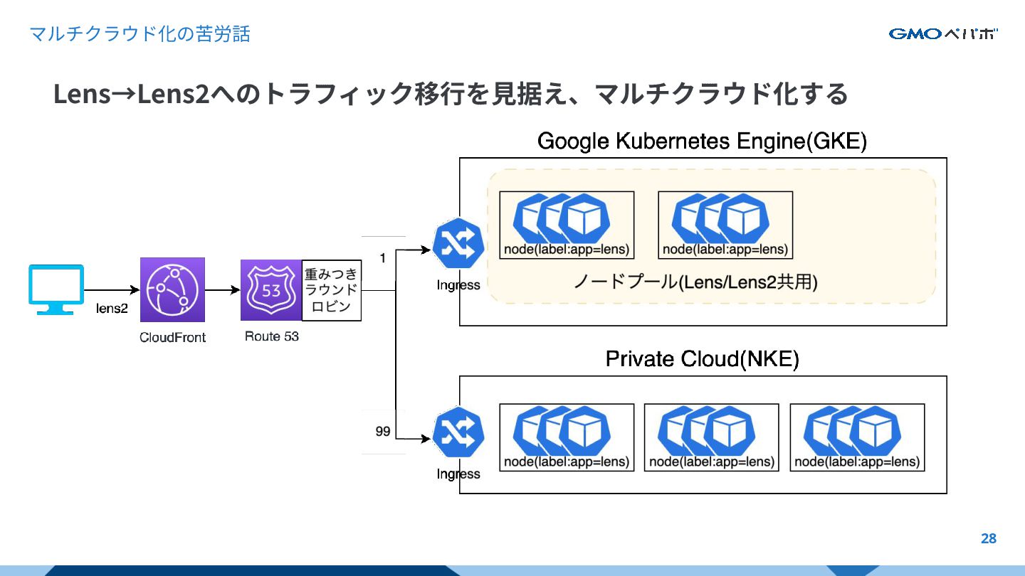 マルチクラウド化の苦労話 28 Lens→Lens2へのトラフィック移⾏を⾒据え、マルチクラウド化する