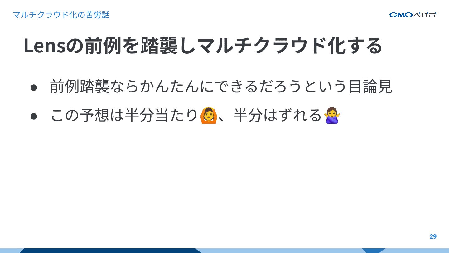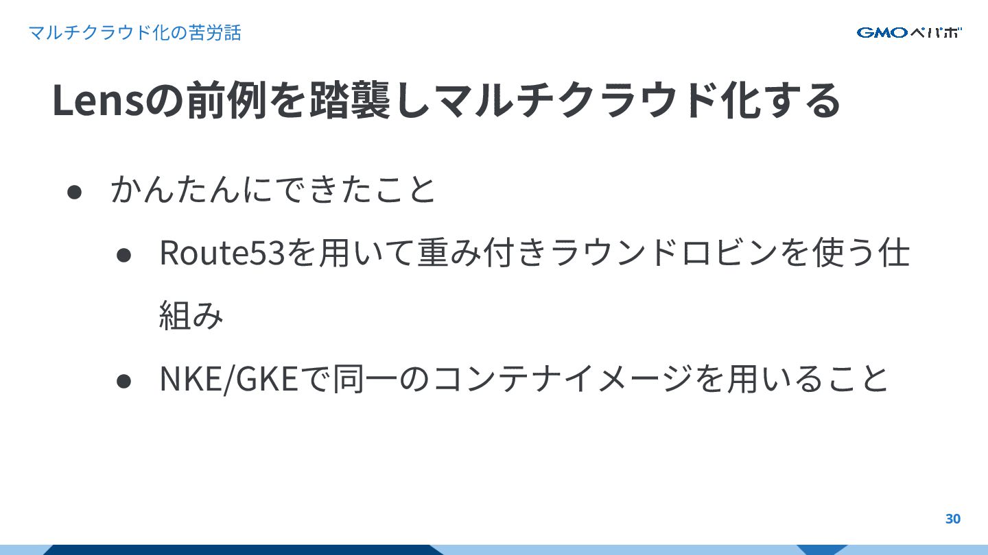 マルチクラウド化の苦労話 29 • 前例踏襲ならかんたんにできるだろうという⽬論⾒ • この予想は半分当たり🙆、半分はずれる Lensの前例を踏襲しマルチクラウド化する