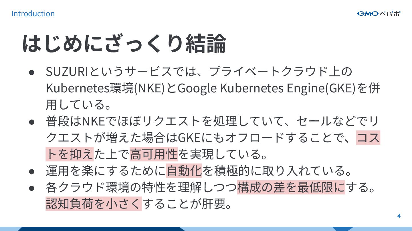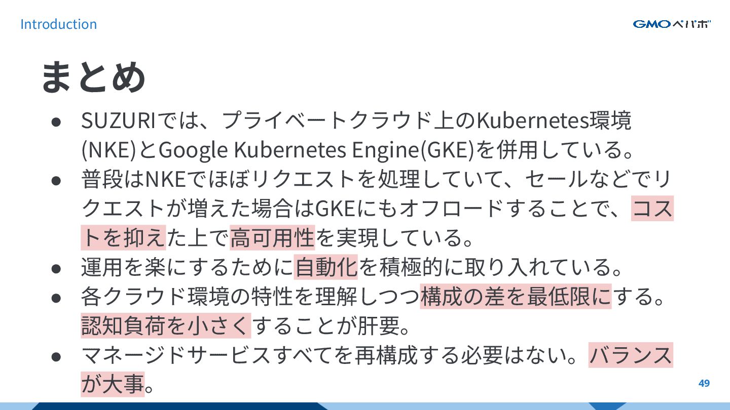 Introduction 49 • SUZURIでは、プライベートクラウド上のKubernetes環境 (NKE)とGoogle Kubernetes Engine(GKE)を併⽤している。 • 普段はNKEでほぼリクエストを処理していて、セールなどでリ クエストが増えた場合はGKEにもオフロードすることで、コス