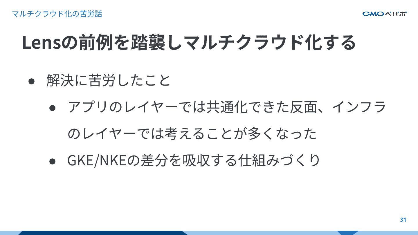 マルチクラウド化の苦労話 30 • かんたんにできたこと • Route53を⽤いて重み付きラウンドロビンを使う仕 組み • NKE/GKEで同⼀のコンテナイメージを⽤いること Lensの前例を踏襲しマルチクラウド化する