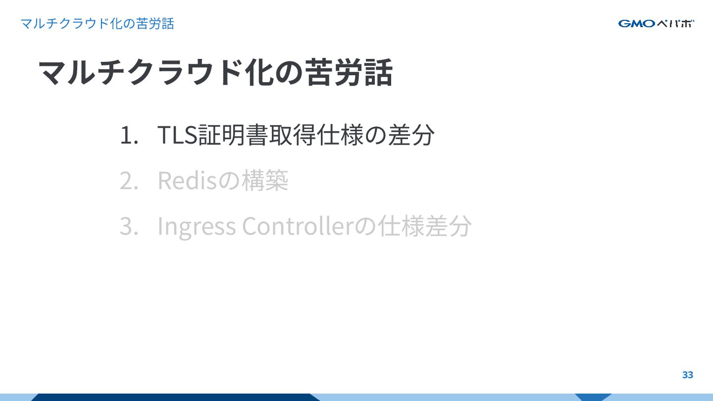 マルチクラウド化の苦労話 32 1. TLS証明書取得仕様の差分 2. Redisの構築 3. Ingress Controllerの仕様差分 マルチクラウド化の苦労話