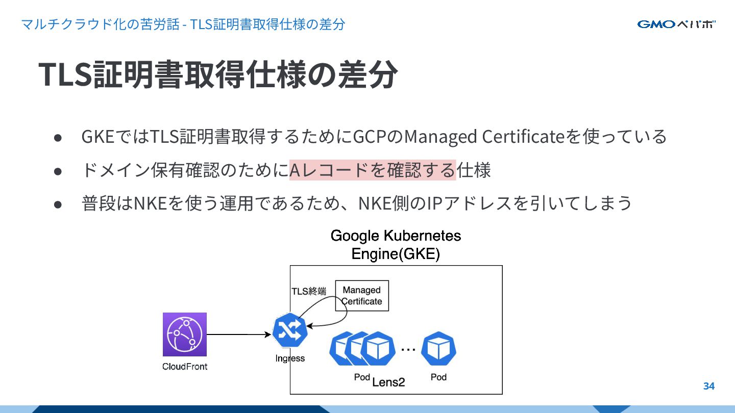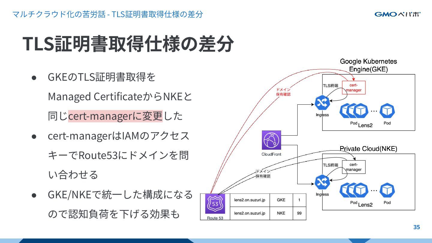 マルチクラウド化の苦労話 - TLS証明書取得仕様の差分 34 • GKEではTLS証明書取得するためにGCPのManaged Certificateを使っている • ドメイン保有確認のためにAレコードを確認する仕様 •