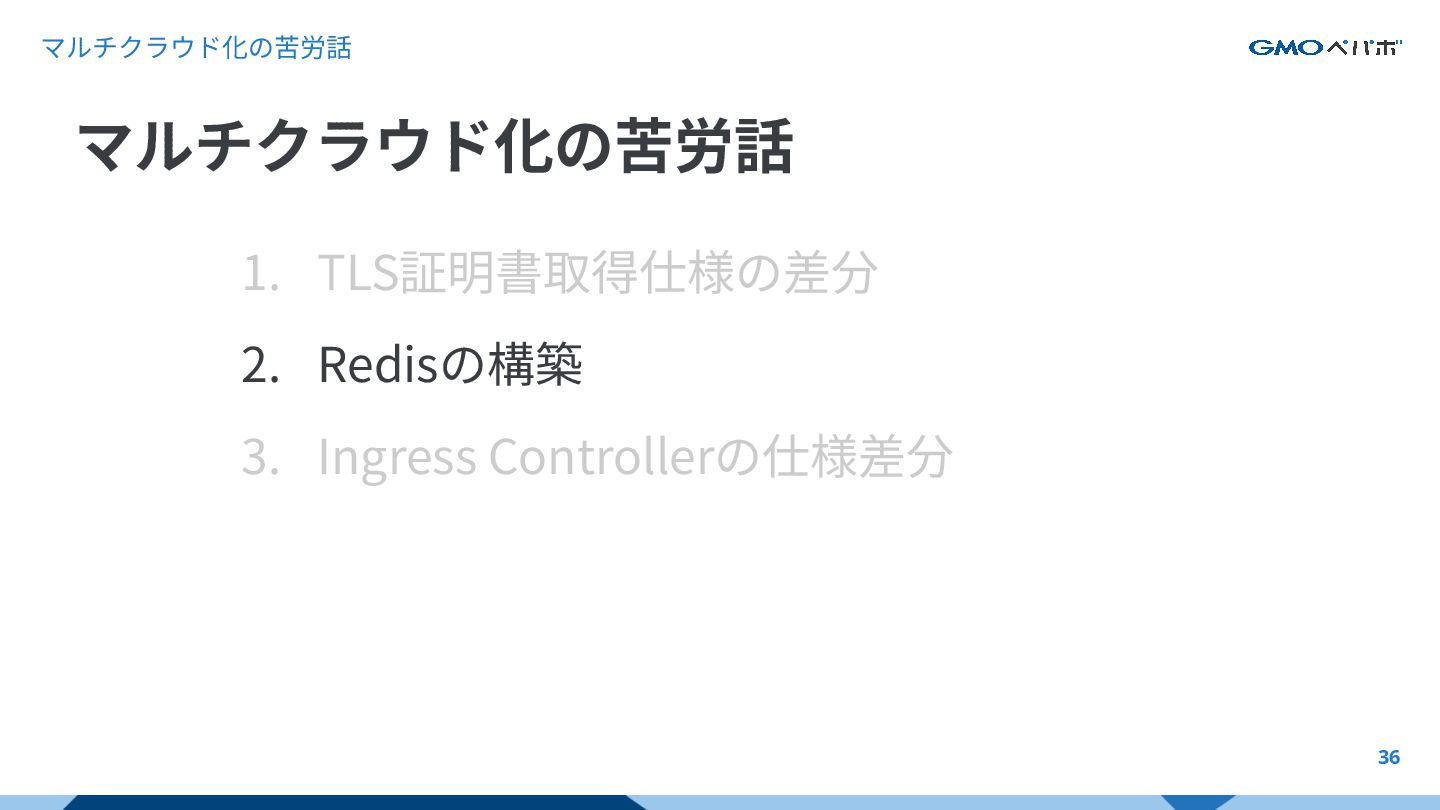 マルチクラウド化の苦労話 33 1. TLS証明書取得仕様の差分 2. Redisの構築 3. Ingress Controllerの仕様差分 マルチクラウド化の苦労話