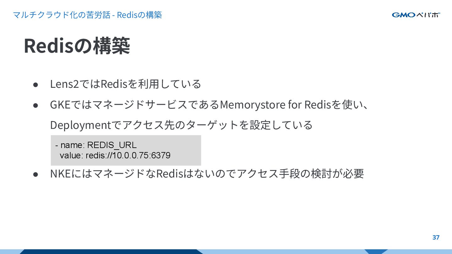 マルチクラウド化の苦労話 - Redisの構築 37 • Lens2ではRedisを利⽤している • GKEではマネージドサービスであるMemorystore for Redisを使い、