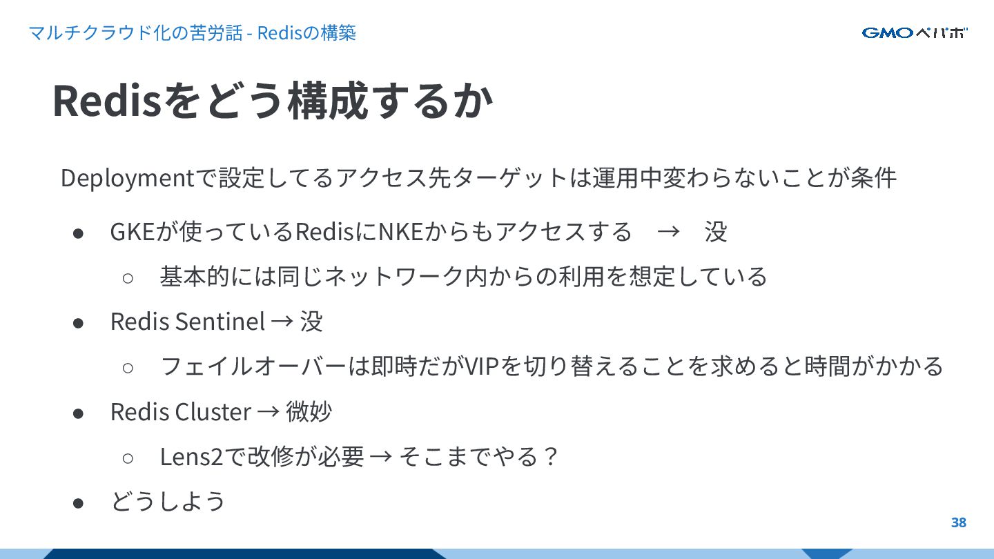 マルチクラウド化の苦労話 - Redisの構築 38 Deploymentで設定してるアクセス先ターゲットは運⽤中変わらないことが条件 • GKEが使っているRedisにNKEからもアクセスする → 没 ◦ 基本的には同じネットワーク内からの利⽤を想定している •