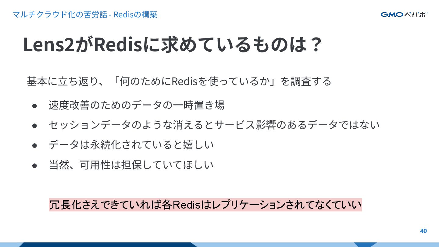 マルチクラウド化の苦労話 - Redisの構築 39 基本に⽴ち返り、「何のためにRedisを使っているか」を調査する • 速度改善のためのデータの⼀時置き場 • セッションデータのような消えるとサービス影響のあるデータではない •