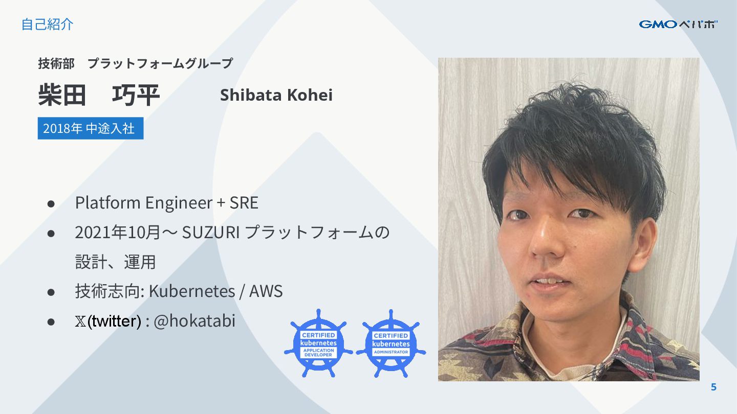 Engineer + SRE • 2021年10⽉〜 SUZURI プラットフォームの 設計、運⽤ • 技術志向: Kubernetes / AWS • 𝕏(twitter) : @hokatabi
