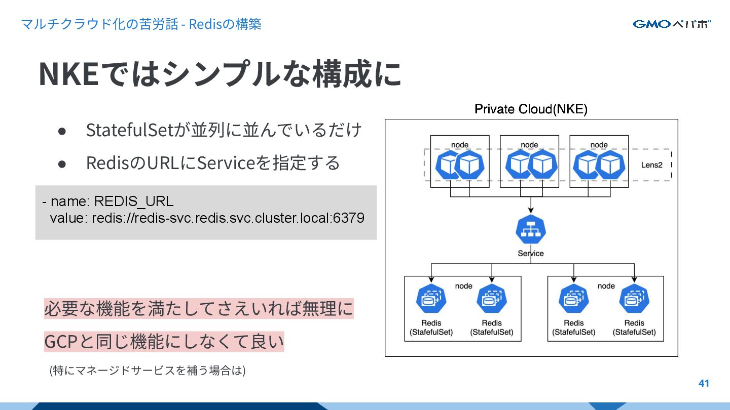 マルチクラウド化の苦労話 - Redisの構築 41 NKEではシンプルな構成に - name: REDIS_URL value: redis://redis-svc.redis.svc.cluster.local:6379