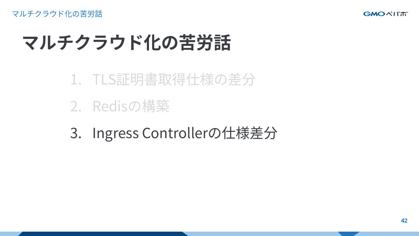 マルチクラウド化の苦労話 42 1. TLS証明書取得仕様の差分 2. Redisの構築 3. Ingress Controllerの仕様差分 マルチクラウド化の苦労話