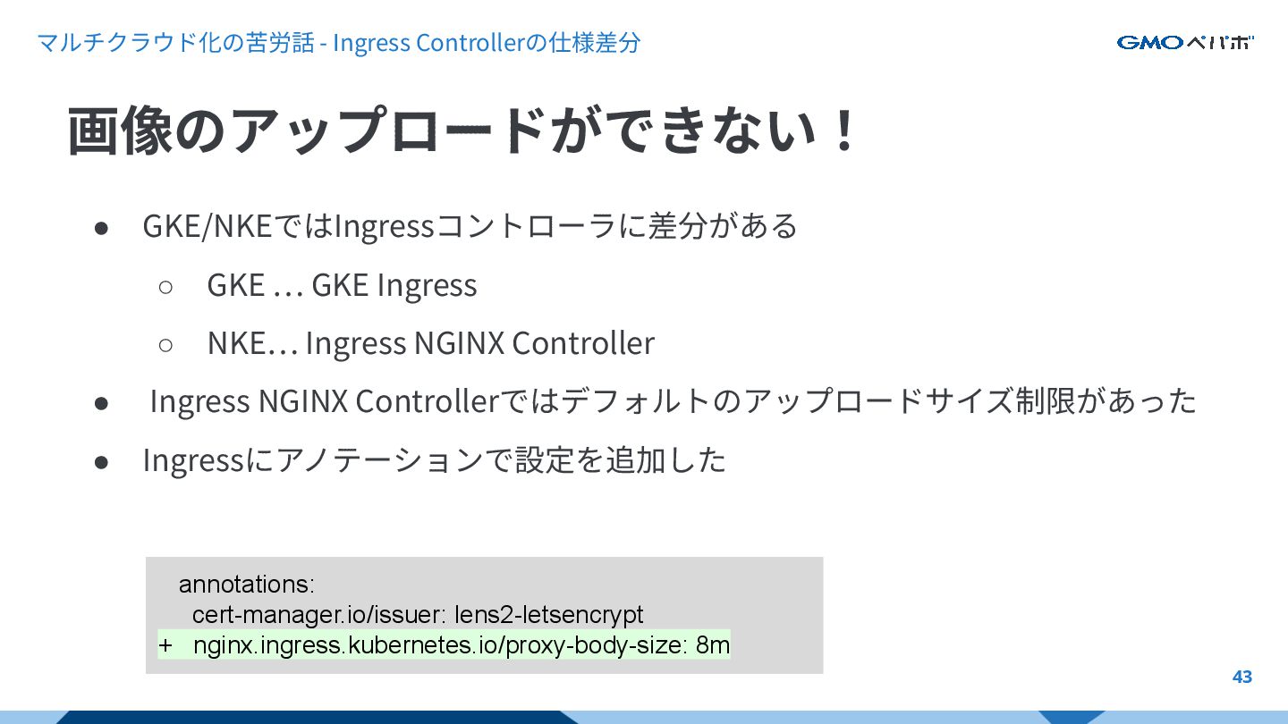 マルチクラウド化の苦労話 - Ingress Controllerの仕様差分 43 • GKE/NKEではIngressコントローラに差分がある ◦ GKE …