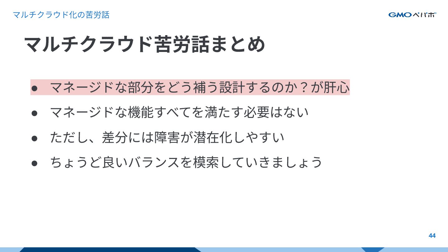 マルチクラウド化の苦労話 44 • マネージドな部分をどう補う設計するのか?が肝⼼ • マネージドな機能すべてを満たす必要はない • ただし、差分には障害が潜在化しやすい • ちょうど良いバランスを模索していきましょう