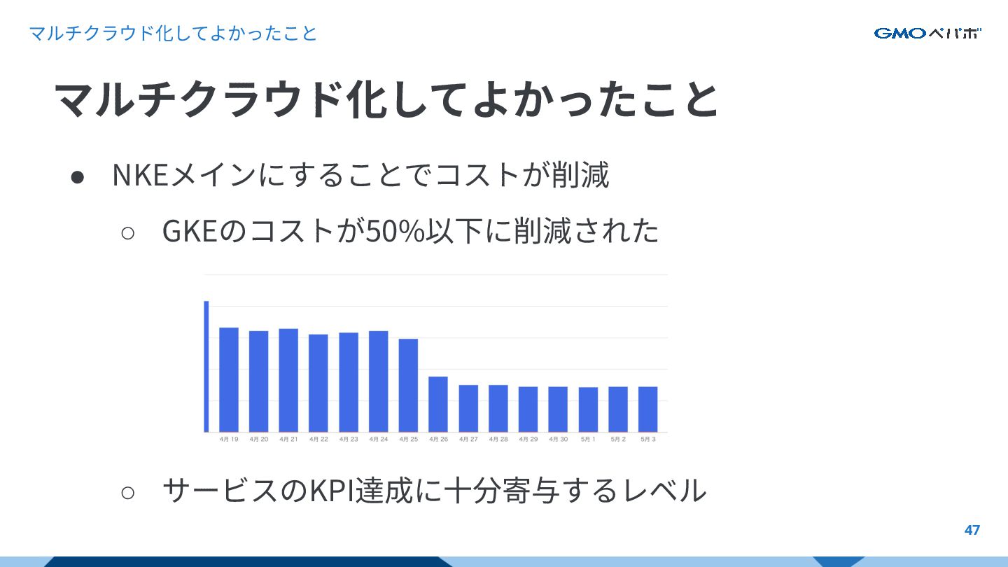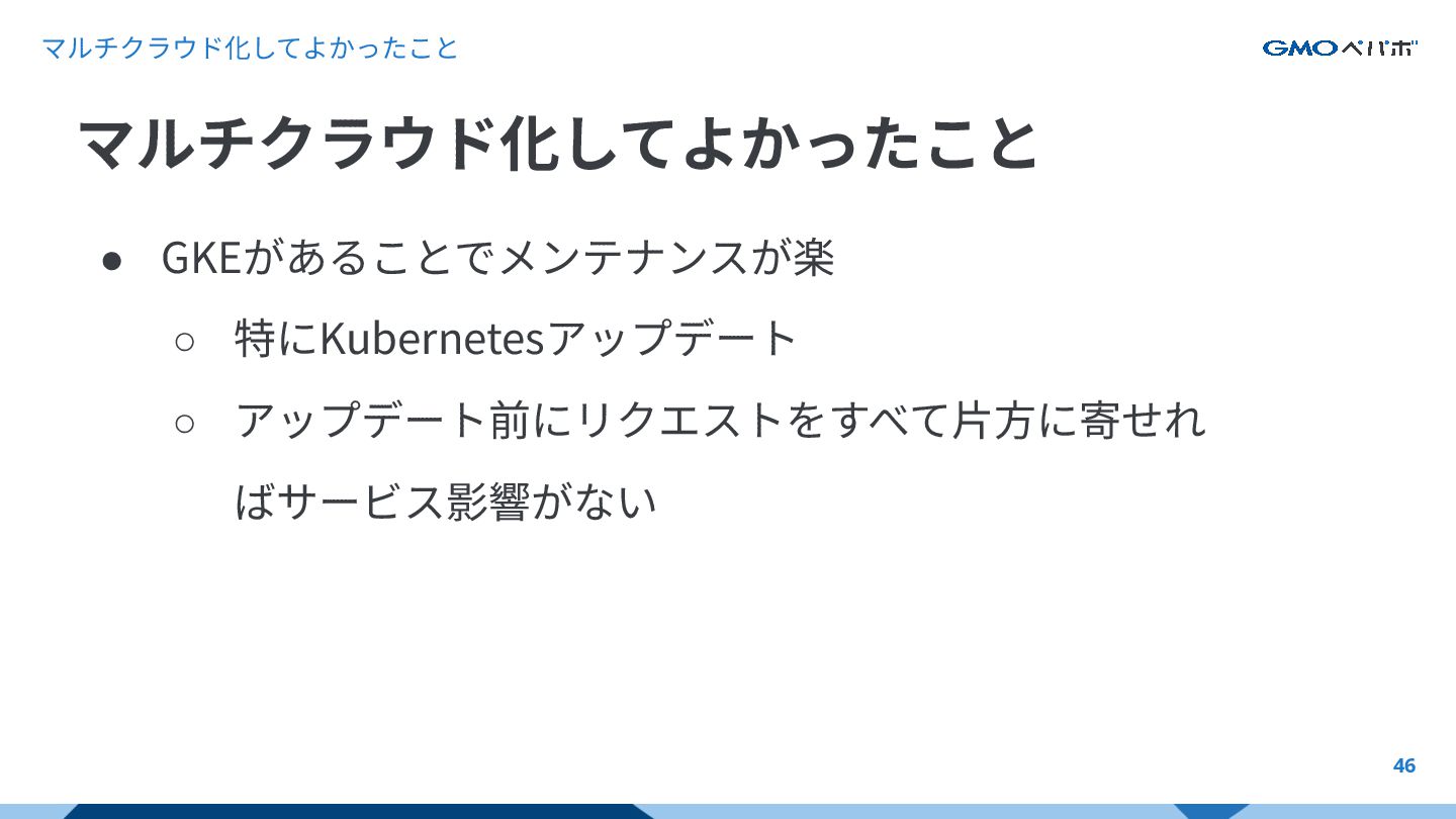 マルチクラウド化してよかったこと 46 • GKEがあることでメンテナンスが楽 ◦ 特にKubernetesアップデート ◦ アップデート前にリクエストをすべて⽚⽅に寄せれ ばサービス影響がない マルチクラウド化してよかったこと