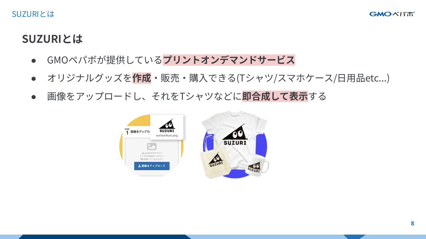 SUZURIとは 8 • GMOペパボが提供しているプリントオンデマンドサービス • オリジナルグッズを作成‧販売‧購⼊できる(Tシャツ/スマホケース/⽇⽤品etc...) • 画像をアップロードし、それをTシャツなどに即合成して表⽰する SUZURIとは