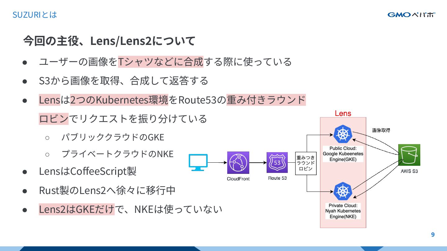 SUZURIとは 9 今回の主役、Lens/Lens2について • ユーザーの画像をTシャツなどに合成する際に使っている • S3から画像を取得、合成して返答する • Lensは2つのKubernetes環境をRoute53の重み付きラウンド ロビンでリクエストを振り分けている