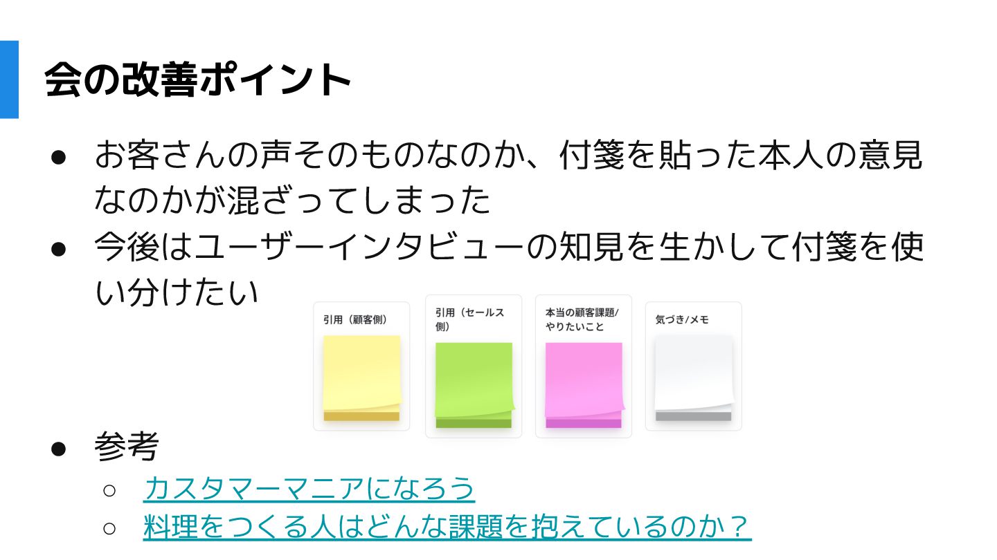 会の改善ポイント • お客さんの声そのものなのか、付箋を貼った本人の意見 なのかが混ざってしまった • 今後はユーザーインタビューの知見を生かして付箋を使 い分けたい • 参考 ◦