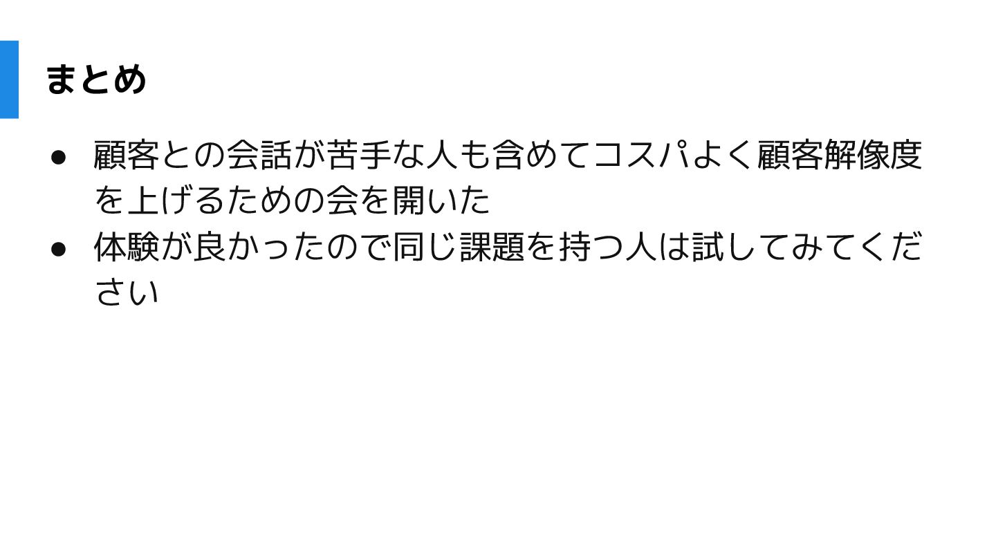 まとめ • 顧客との会話が苦手な人も含めてコスパよく顧客解像度 を上げるための会を開いた • 体験が良かったので同じ課題を持つ人は試してみてくだ さい