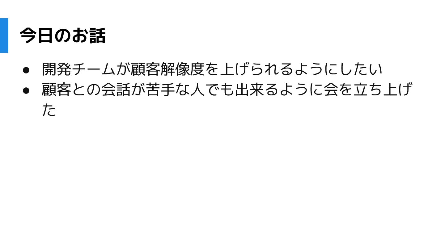 今日のお話 • 開発チームが顧客解像度を上げられるようにしたい • 顧客との会話が苦手な人でも出来るように会を立ち上げ た