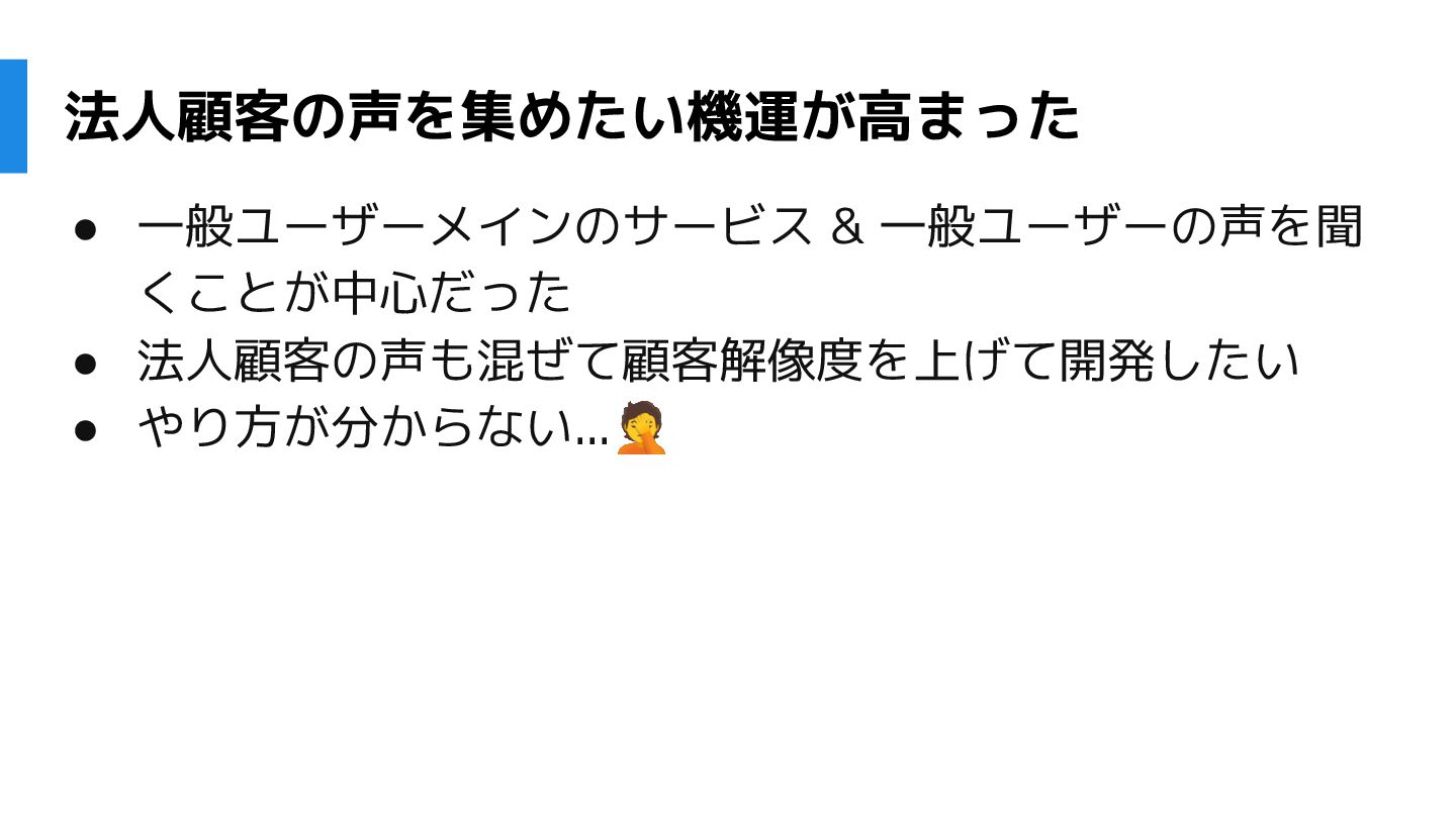 法人顧客の声を集めたい機運が高まった • 一般ユーザーメインのサービス & 一般ユーザーの声を聞 くことが中心だった • 法人顧客の声も混ぜて顧客解像度を上げて開発したい • やり方が分からない...🤦