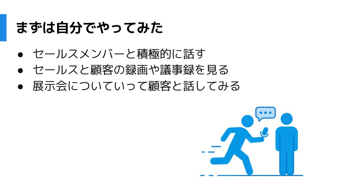 まずは自分でやってみた • セールスメンバーと積極的に話す • セールスと顧客の録画や議事録を見る • 展示会についていって顧客と話してみる
