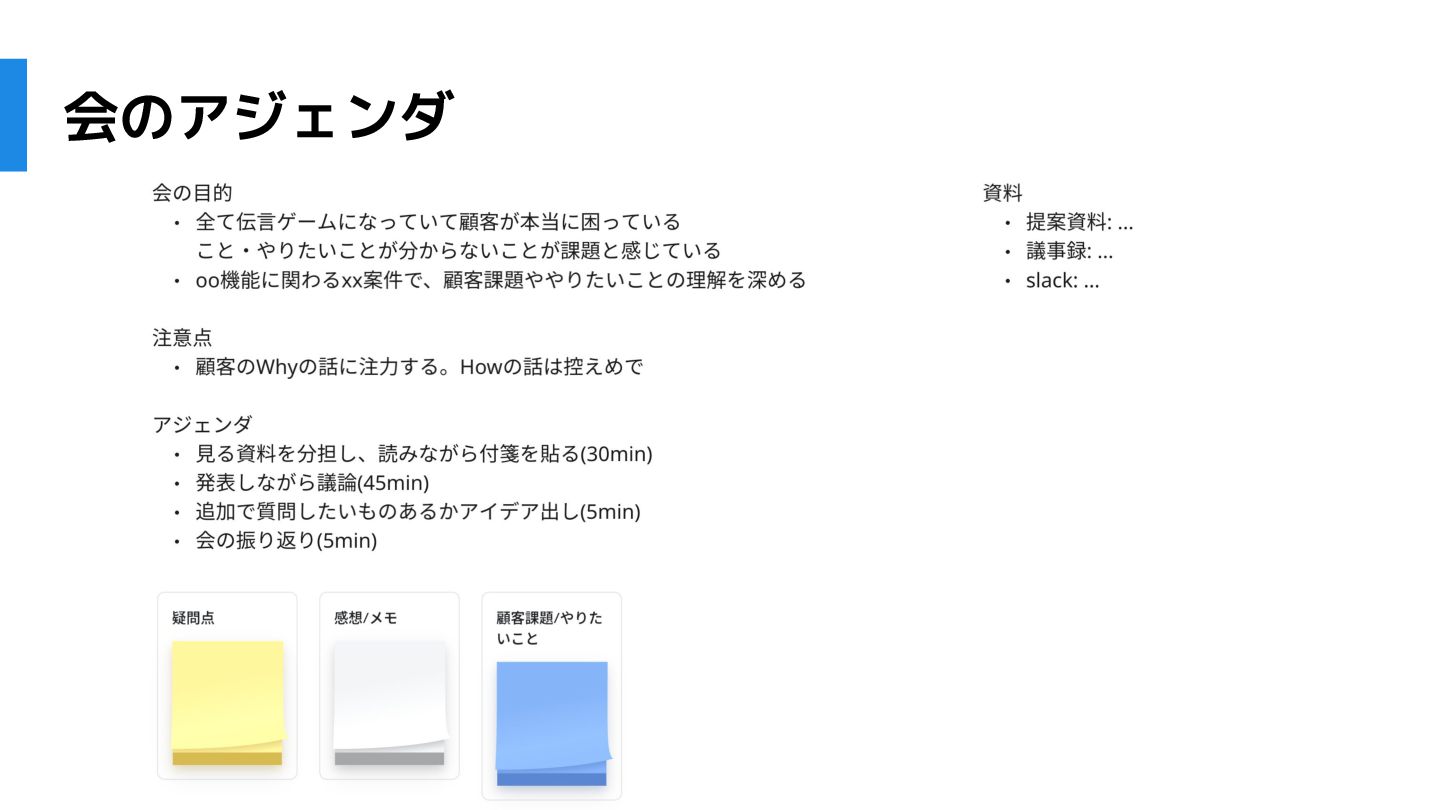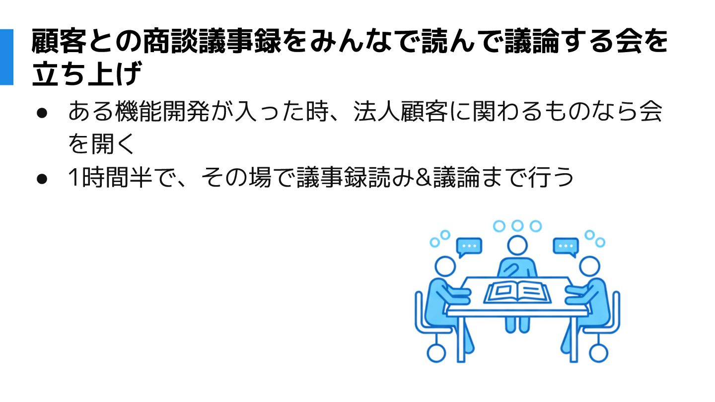 顧客との商談議事録をみんなで読んで議論する会を 立ち上げ • ある機能開発が入った時、法人顧客に関わるものなら会 を開く • 1時間半で、その場で議事録読み&議論まで行う