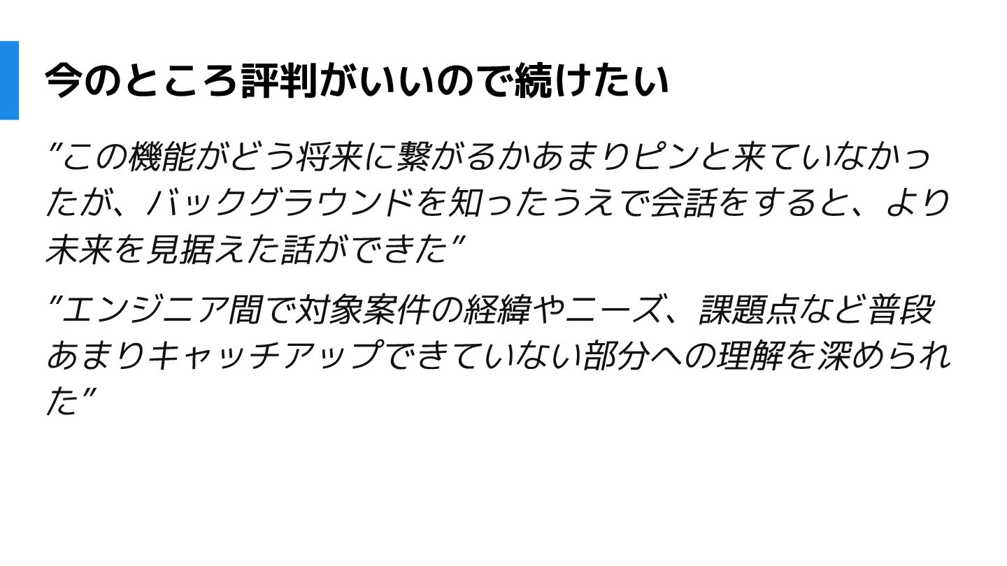 知ったうえで 会話を すると、 より 未来を 見据えた 話が できた ” ”エンジニア間で対象案件の経緯やニーズ、課題点など普段 あまりキャッチアップできていない部分への理解を深められ た”