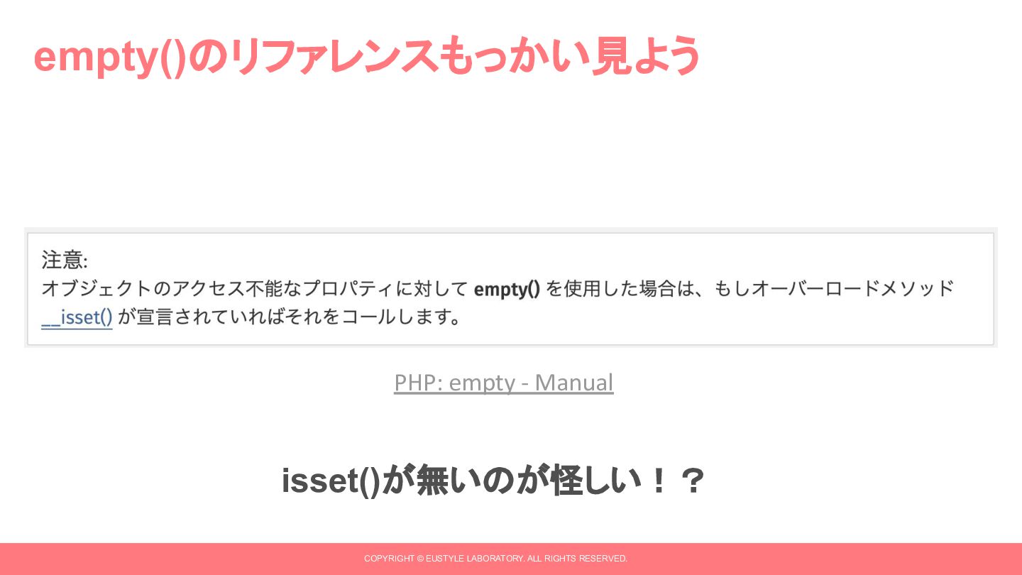 COPYRIGHT © EUSTYLE LABORATORY. ALL RIGHTS RESERVED. empty()のリファレンスもっかい見よう 6 isset()が無いのが怪しい!?