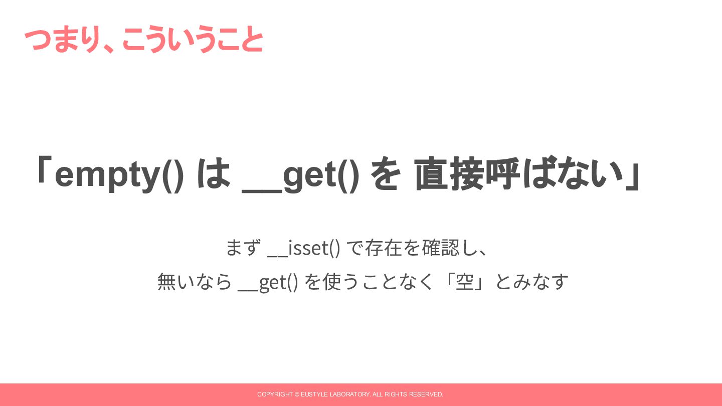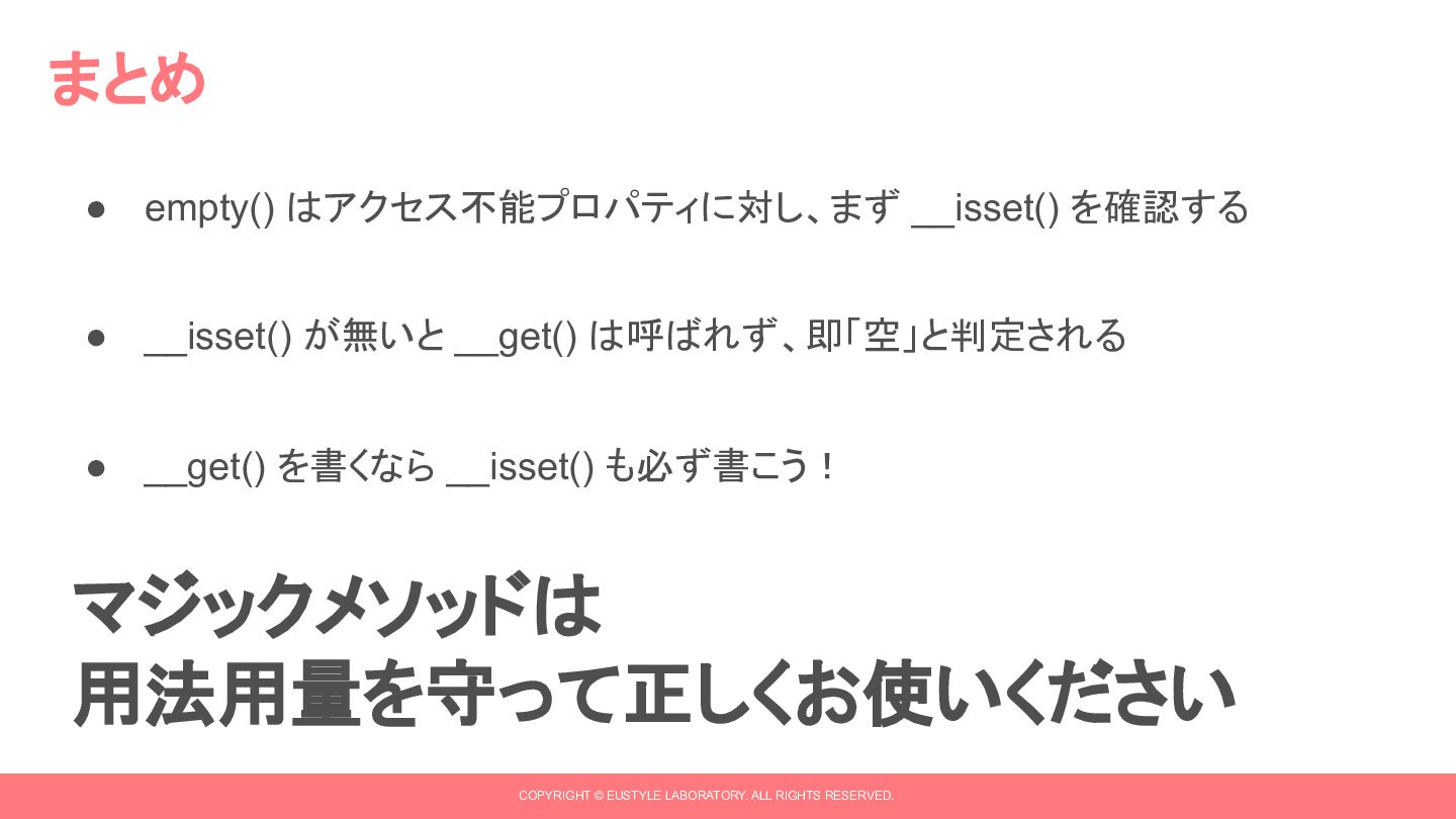 empty() はアクセス不能プロパティに対し、まず __isset() を確認する • __isset() が無いと __get() は呼ばれず、即「空」と判定される • __get() を書くなら __isset() も必ず書こう! マジックメソッドは 用法用量を守って正しくお使いください