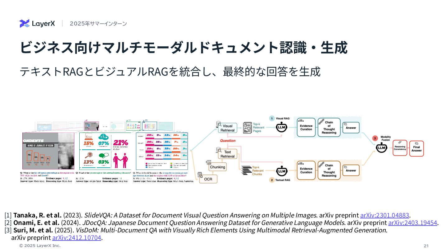 R. et al. (2023). SlideVQA: A Dataset for Document Visual Question Answering on Multiple Images. arXiv preprint arXiv:2301.04883. [2] Onami, E. et al. (2024). JDocQA: Japanese Document Question Answering Dataset for Generative Language Models. arXiv preprint arXiv:2403.19454. [3] Suri, M. et al. (2025). VisDoM: Multi-Document QA with Visually Rich Elements Using Multimodal Retrieval-Augmented Generation. arXiv preprint arXiv:2412.10704.
