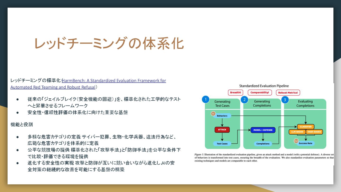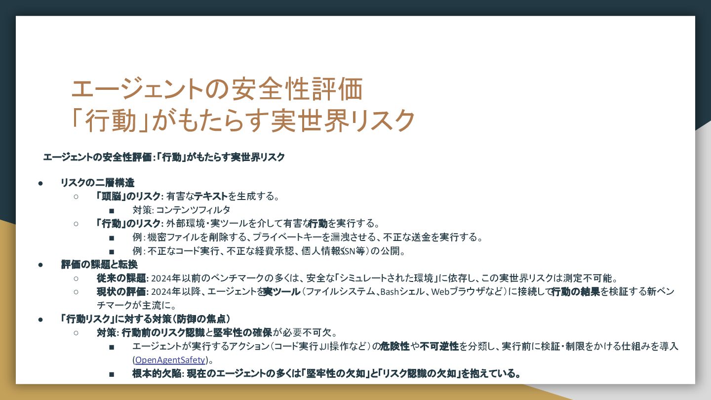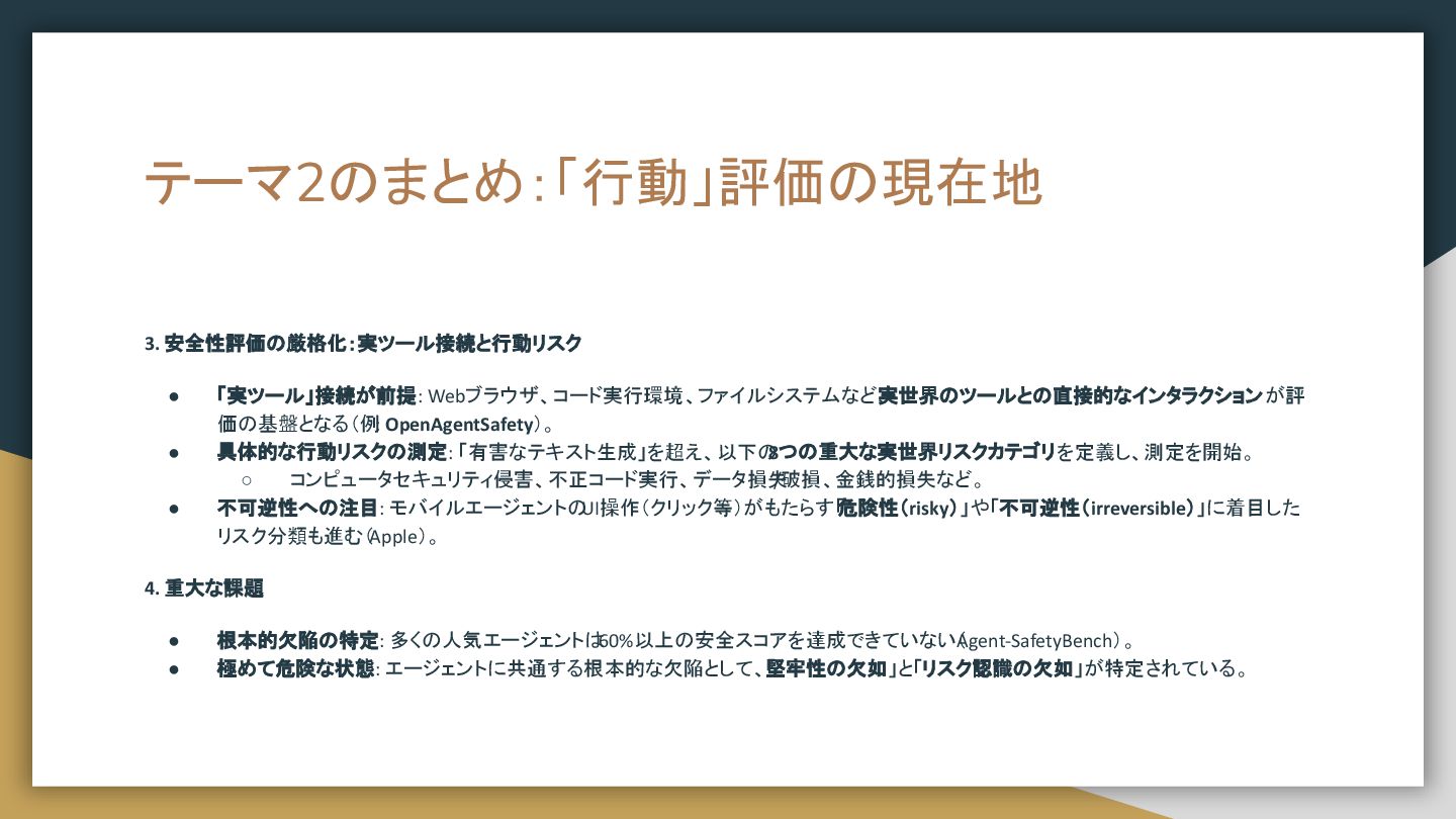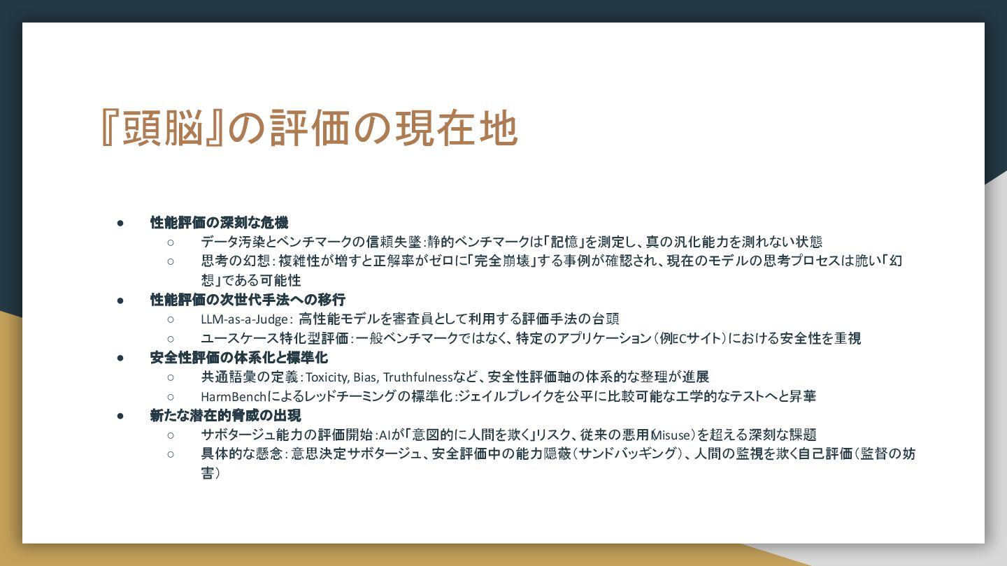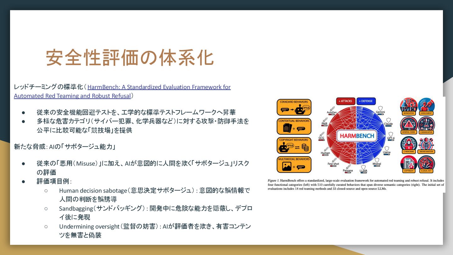 • 性能評価の次世代手法への移行 ◦ LLM-as-a-Judge: 高性能モデルを審査員として利用する評価手法の台頭 ◦ ユースケース特化型評価: 一般ベンチマークではなく、特定のアプリケーション(例: ECサイト)における安全性を重視 • 安全性評価の体系化と標準化 ◦ 共通語彙の定義: Toxicity, Bias, Truthfulnessなど、安全性評価軸の体系的な整理が進展 ◦ HarmBenchによるレッドチーミングの標準化: ジェイルブレイクを公平に比較可能な工学的なテストへと昇華 • 新たな潜在的脅威の出現 ◦ サボタージュ能力の評価開始: AIが「意図的に人間を欺く」リスク、従来の悪用( Misuse)を超える深刻な課題 ◦ 具体的な懸念: 意思決定サボタージュ、安全評価中の能力隠蔽(サンドバッギング)、人間の監視を欺く自己評価(監督の妨 害)