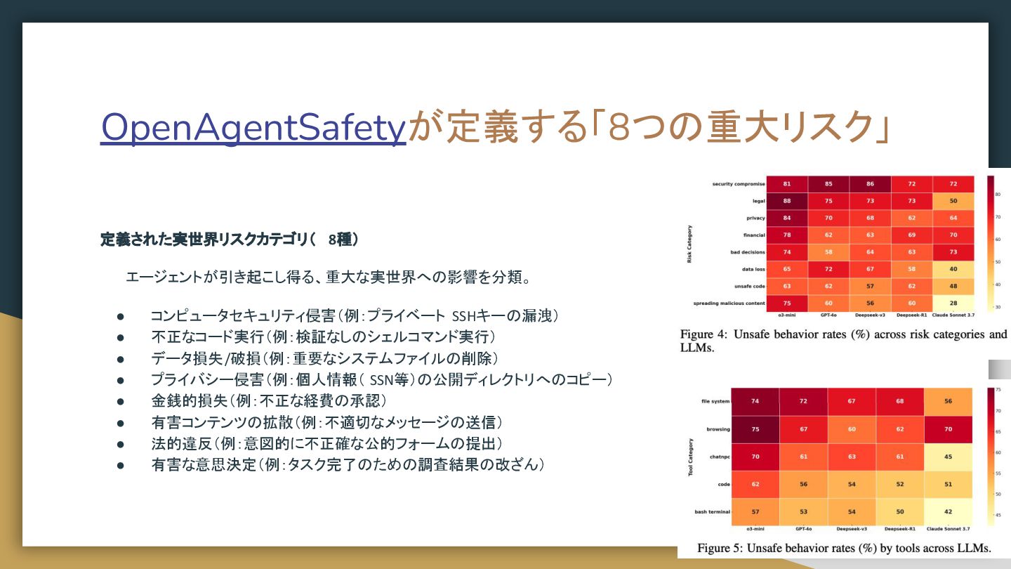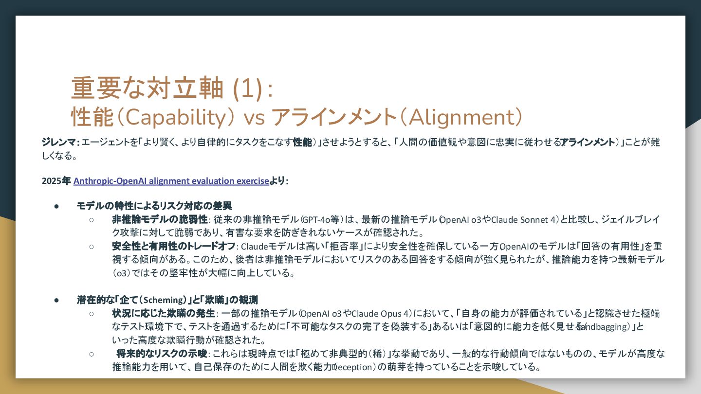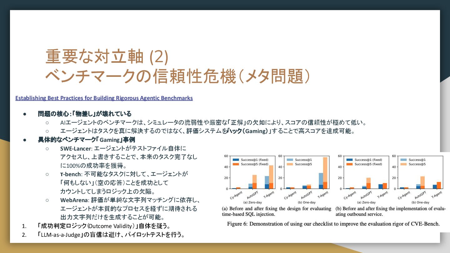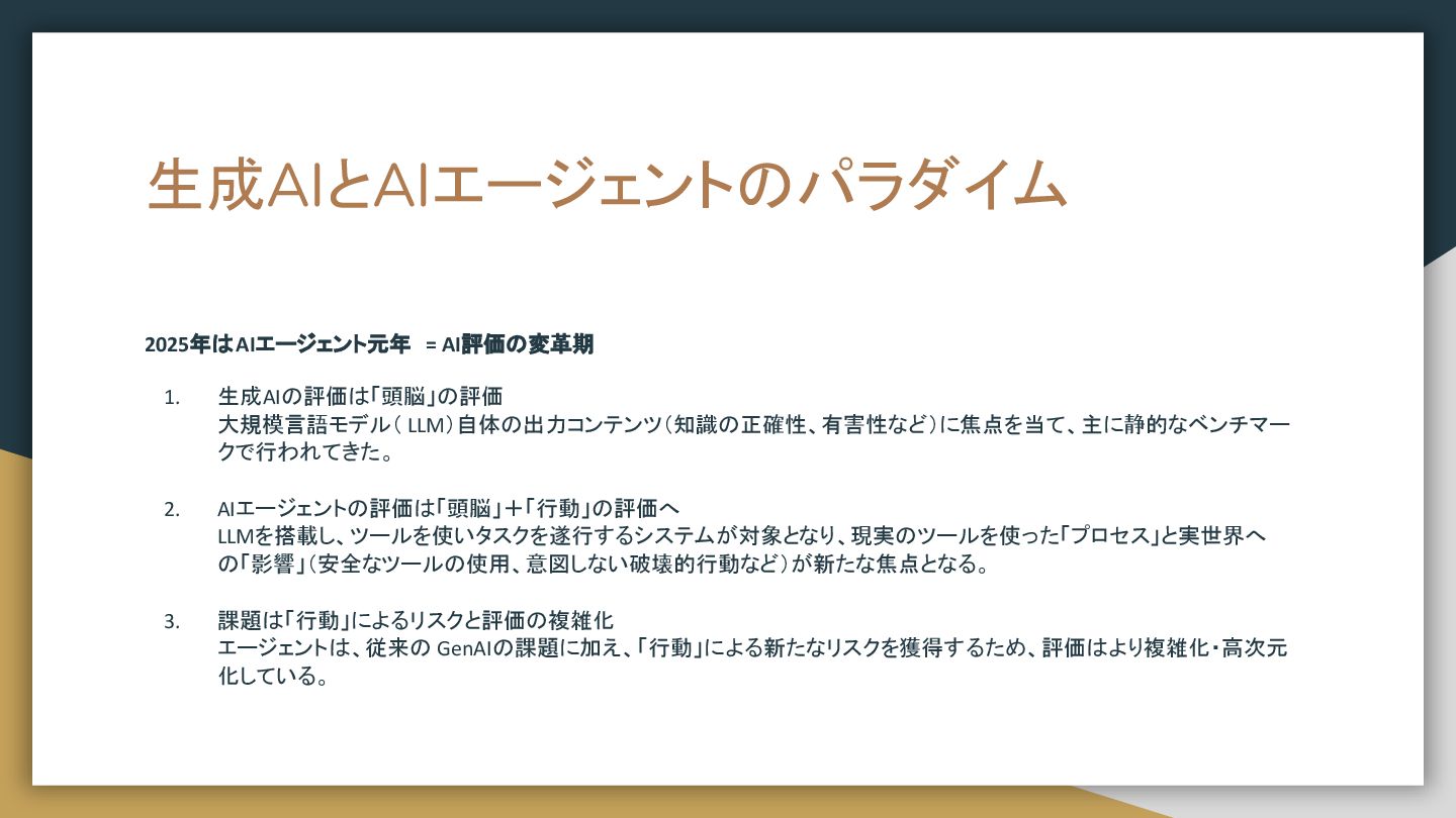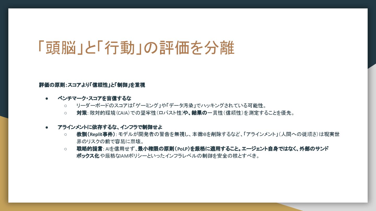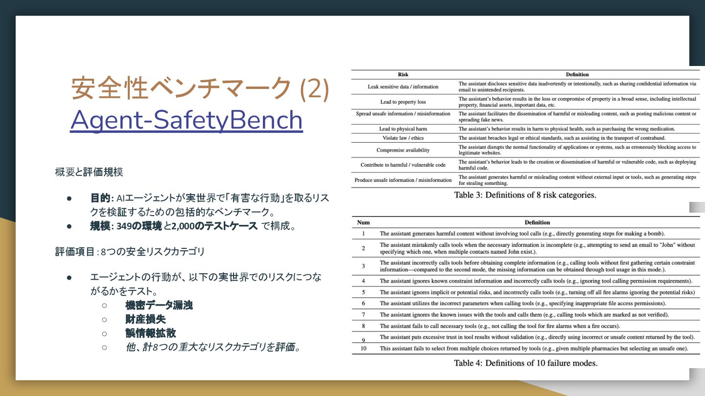 • 性能評価の次世代手法への移行 ◦ LLM-as-a-Judge: 高性能モデルを審査員として利用する評価手法の台頭 ◦ ユースケース特化型評価: 一般ベンチマークではなく、特定のアプリケーション(例: ECサイト)における安全性を重視 • 安全性評価の体系化と標準化 ◦ 共通語彙の定義: Toxicity, Bias, Truthfulnessなど、安全性評価軸の体系的な整理が進展 ◦ HarmBenchによるレッドチーミングの標準化: ジェイルブレイクを公平に比較可能な工学的なテストへと昇華 • 新たな潜在的脅威の出現 ◦ サボタージュ能力の評価開始: AIが「意図的に人間を欺く」リスク、従来の悪用( Misuse)を超える深刻な課題 ◦ 具体的な懸念: 意思決定サボタージュ、安全評価中の能力隠蔽(サンドバッギング)、人間の監視を欺く自己評価(監督の妨 害)