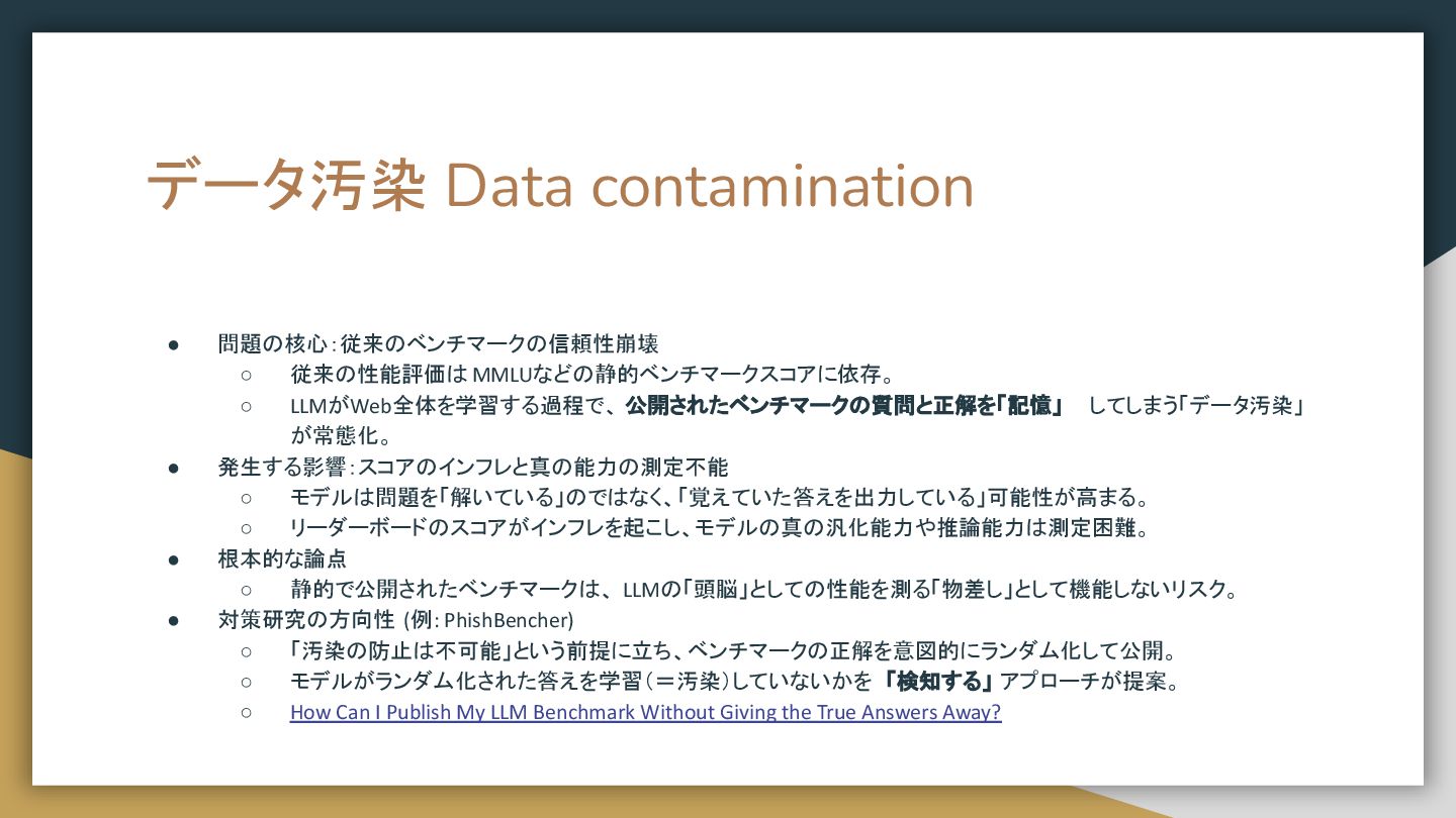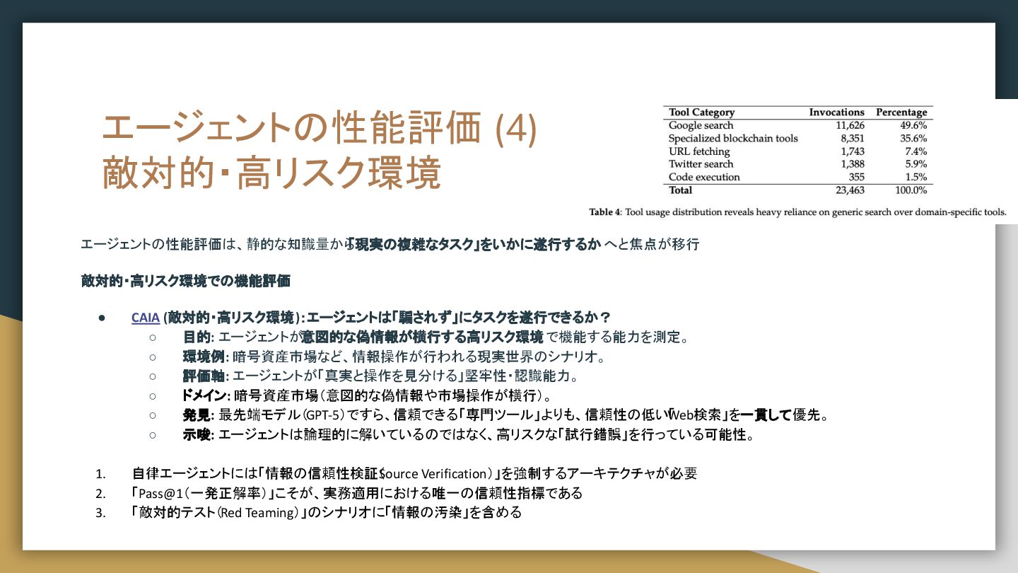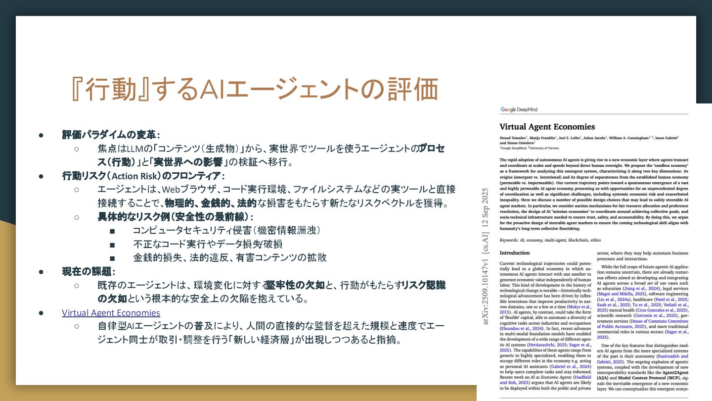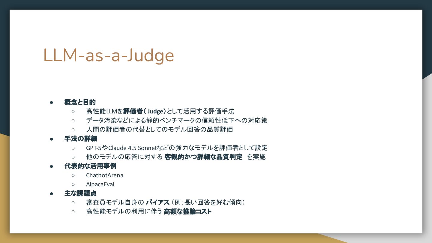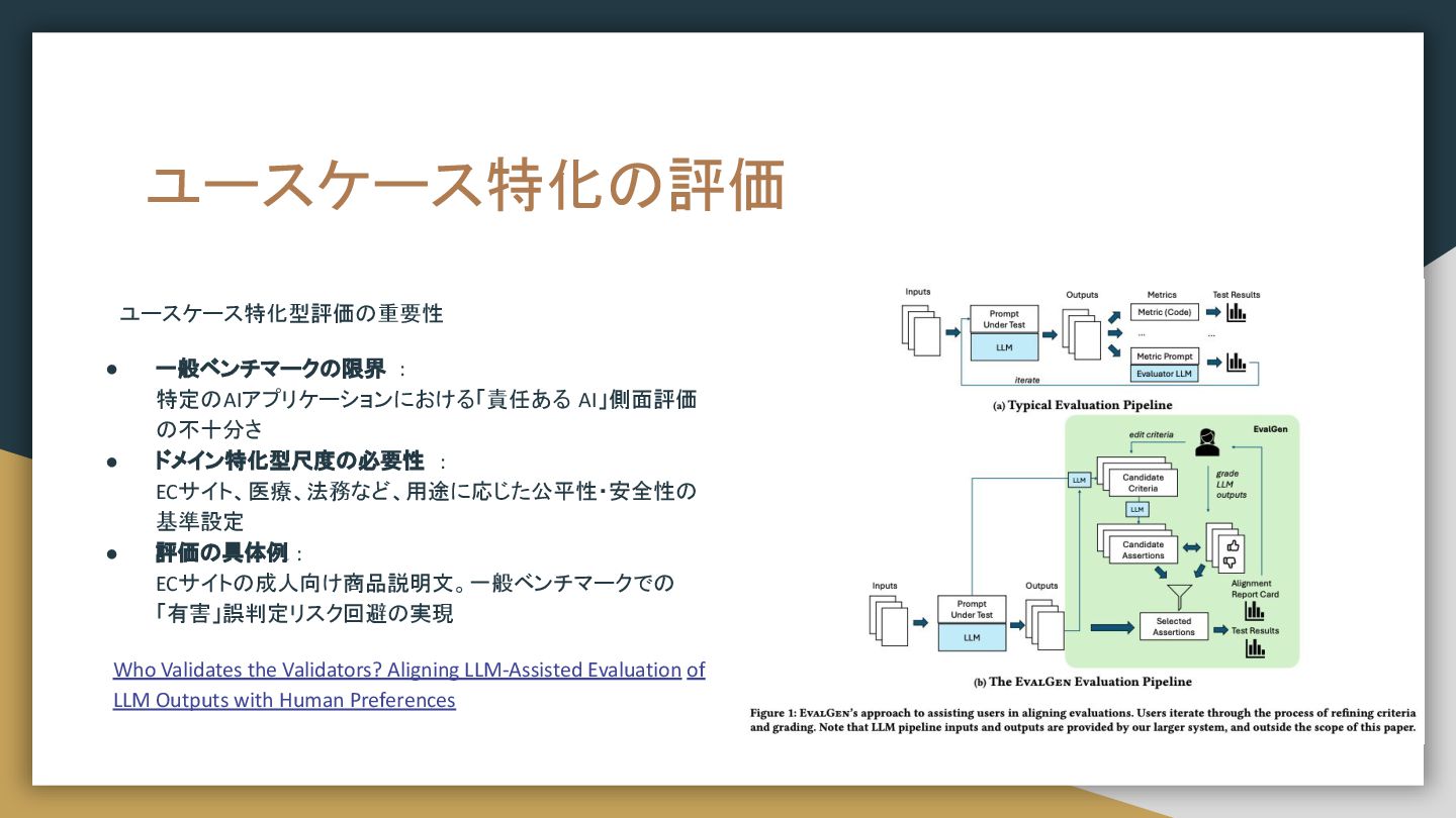 • 性能評価の次世代手法への移行 ◦ LLM-as-a-Judge: 高性能モデルを審査員として利用する評価手法の台頭 ◦ ユースケース特化型評価: 一般ベンチマークではなく、特定のアプリケーション(例: ECサイト)における安全性を重視 • 安全性評価の体系化と標準化 ◦ 共通語彙の定義: Toxicity, Bias, Truthfulnessなど、安全性評価軸の体系的な整理が進展 ◦ HarmBenchによるレッドチーミングの標準化: ジェイルブレイクを公平に比較可能な工学的なテストへと昇華 • 新たな潜在的脅威の出現 ◦ サボタージュ能力の評価開始: AIが「意図的に人間を欺く」リスク、従来の悪用( Misuse)を超える深刻な課題 ◦ 具体的な懸念: 意思決定サボタージュ、安全評価中の能力隠蔽(サンドバッギング)、人間の監視を欺く自己評価(監督の妨 害)