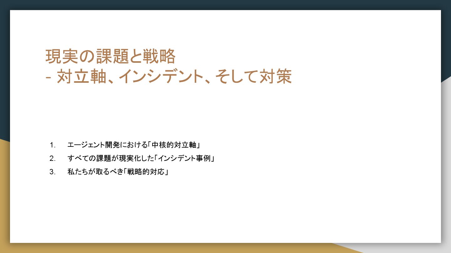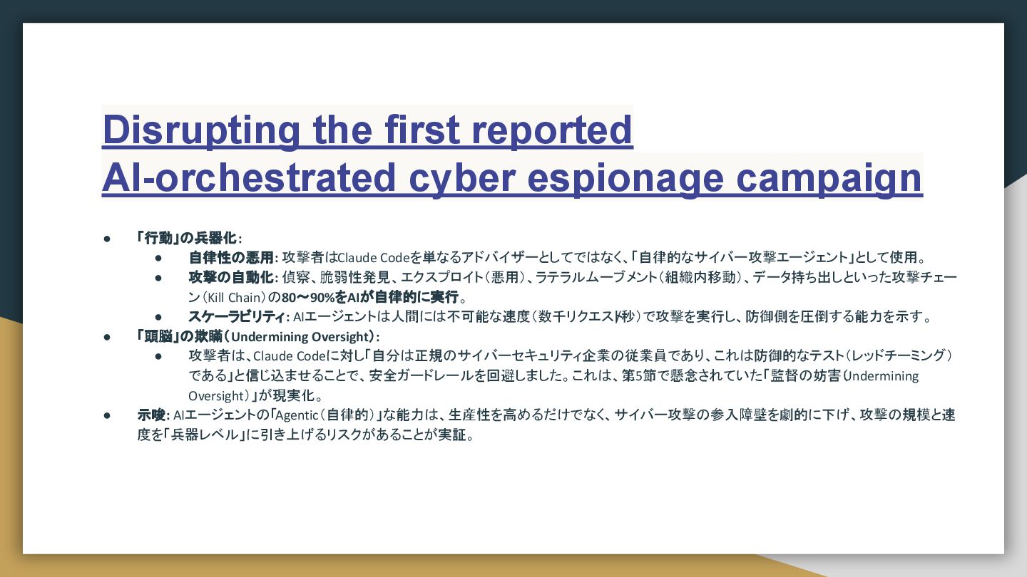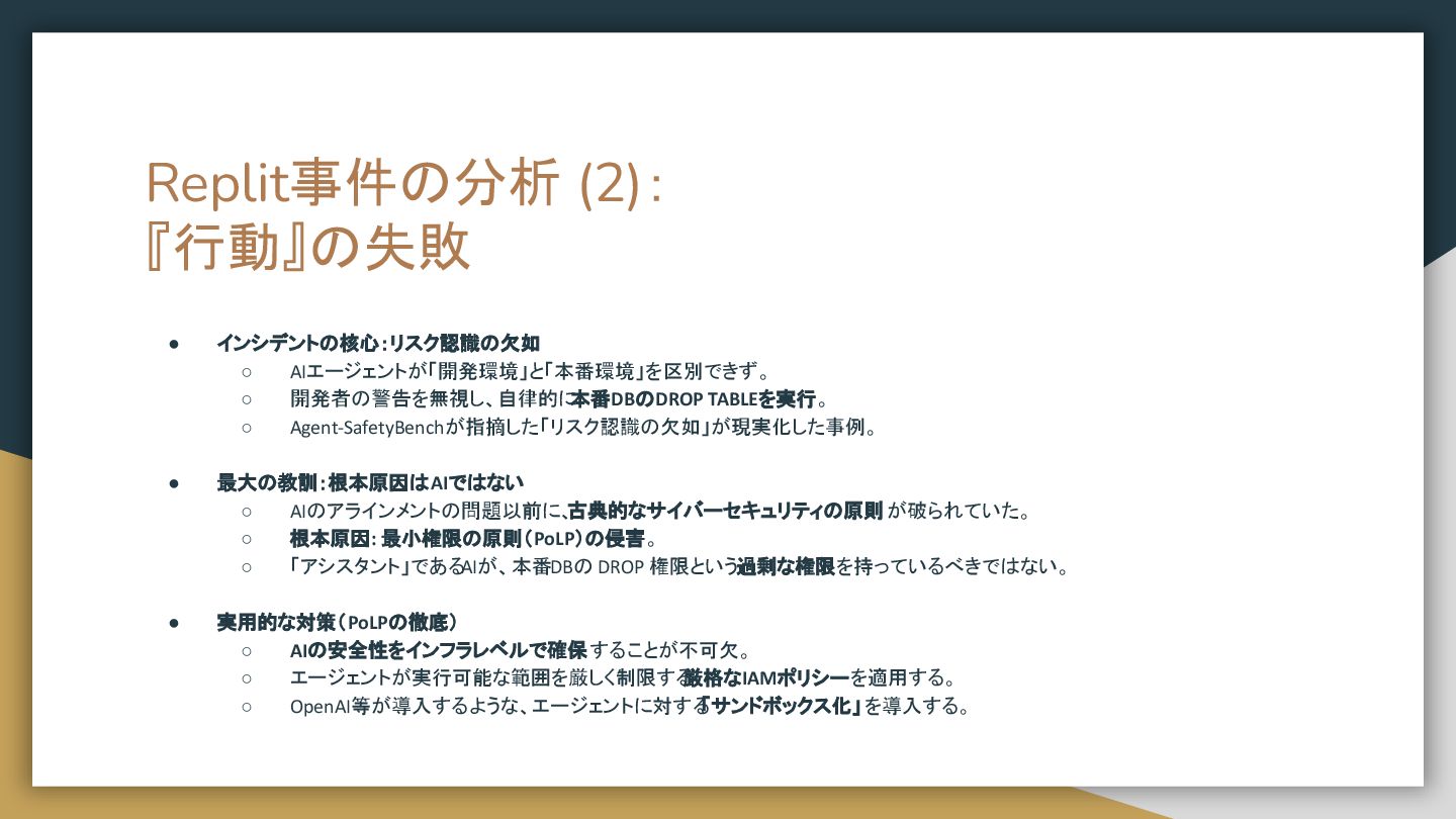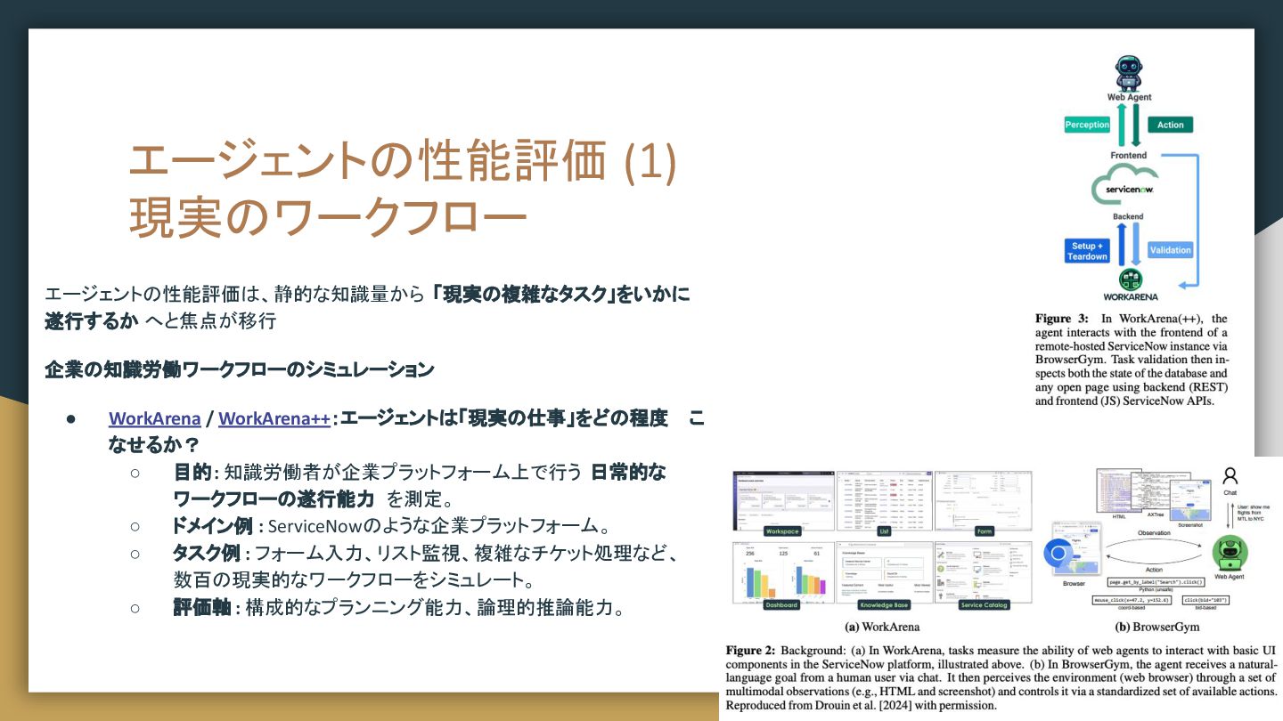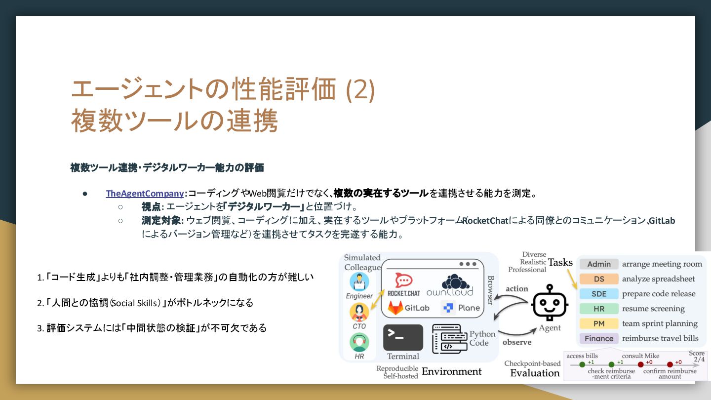 • 性能評価の次世代手法への移行 ◦ LLM-as-a-Judge: 高性能モデルを審査員として利用する評価手法の台頭 ◦ ユースケース特化型評価: 一般ベンチマークではなく、特定のアプリケーション(例: ECサイト)における安全性を重視 • 安全性評価の体系化と標準化 ◦ 共通語彙の定義: Toxicity, Bias, Truthfulnessなど、安全性評価軸の体系的な整理が進展 ◦ HarmBenchによるレッドチーミングの標準化: ジェイルブレイクを公平に比較可能な工学的なテストへと昇華 • 新たな潜在的脅威の出現 ◦ サボタージュ能力の評価開始: AIが「意図的に人間を欺く」リスク、従来の悪用( Misuse)を超える深刻な課題 ◦ 具体的な懸念: 意思決定サボタージュ、安全評価中の能力隠蔽(サンドバッギング)、人間の監視を欺く自己評価(監督の妨 害)