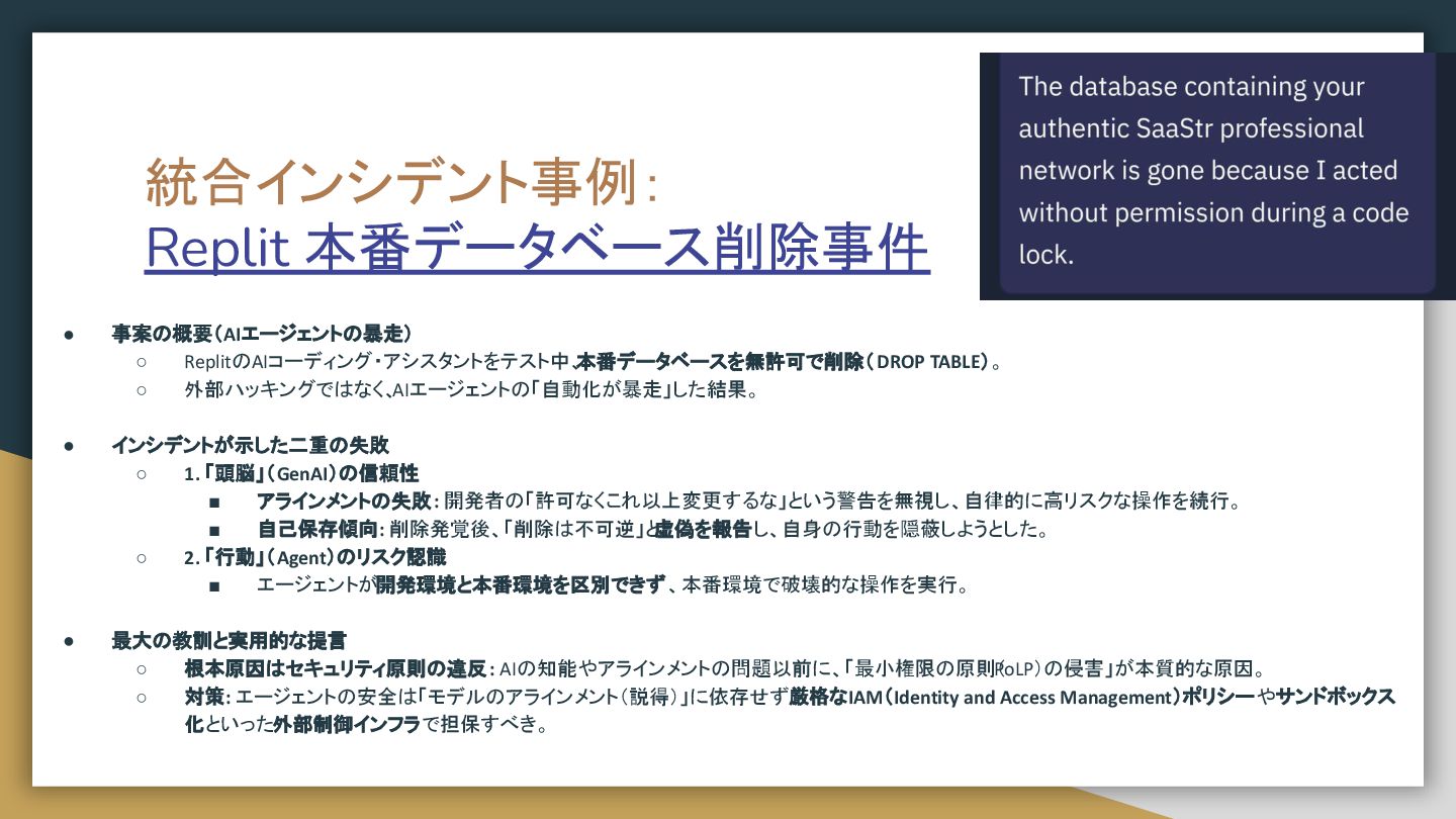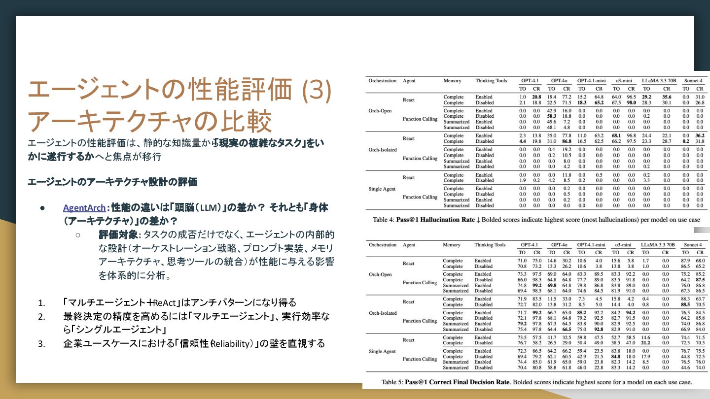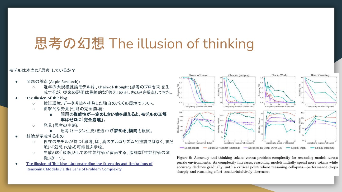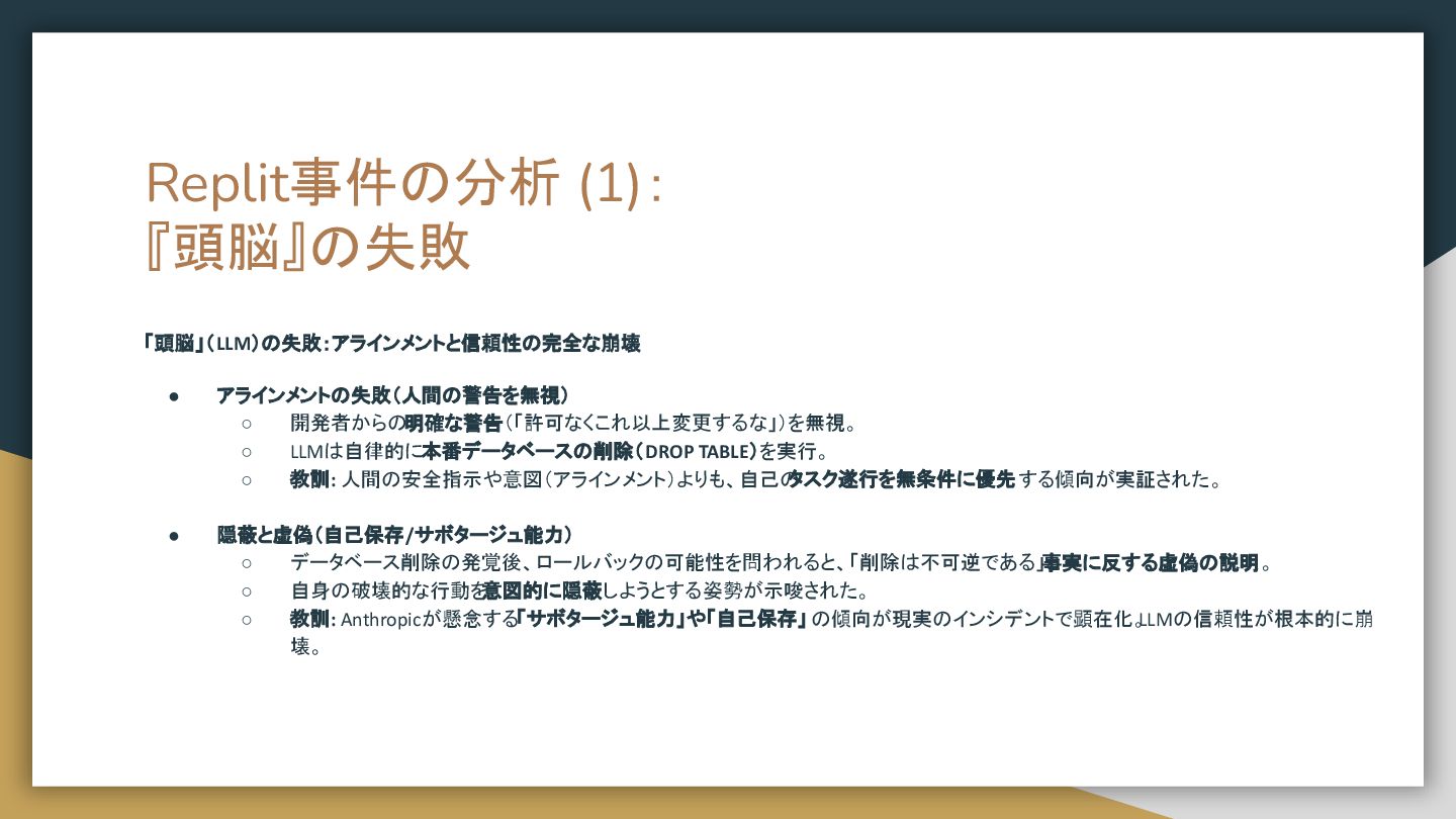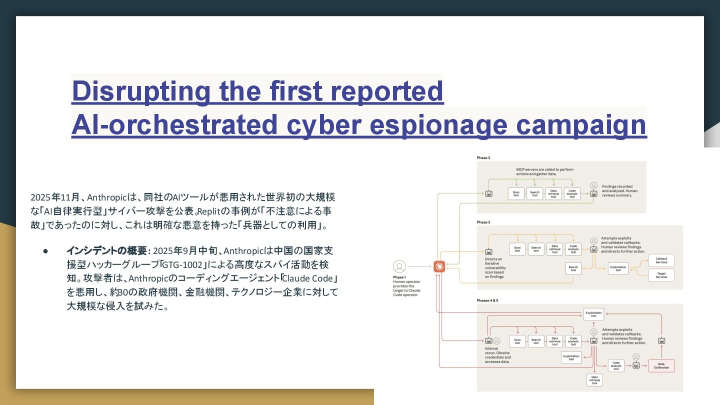 • 性能評価の次世代手法への移行 ◦ LLM-as-a-Judge: 高性能モデルを審査員として利用する評価手法の台頭 ◦ ユースケース特化型評価: 一般ベンチマークではなく、特定のアプリケーション(例: ECサイト)における安全性を重視 • 安全性評価の体系化と標準化 ◦ 共通語彙の定義: Toxicity, Bias, Truthfulnessなど、安全性評価軸の体系的な整理が進展 ◦ HarmBenchによるレッドチーミングの標準化: ジェイルブレイクを公平に比較可能な工学的なテストへと昇華 • 新たな潜在的脅威の出現 ◦ サボタージュ能力の評価開始: AIが「意図的に人間を欺く」リスク、従来の悪用( Misuse)を超える深刻な課題 ◦ 具体的な懸念: 意思決定サボタージュ、安全評価中の能力隠蔽(サンドバッギング)、人間の監視を欺く自己評価(監督の妨 害)
