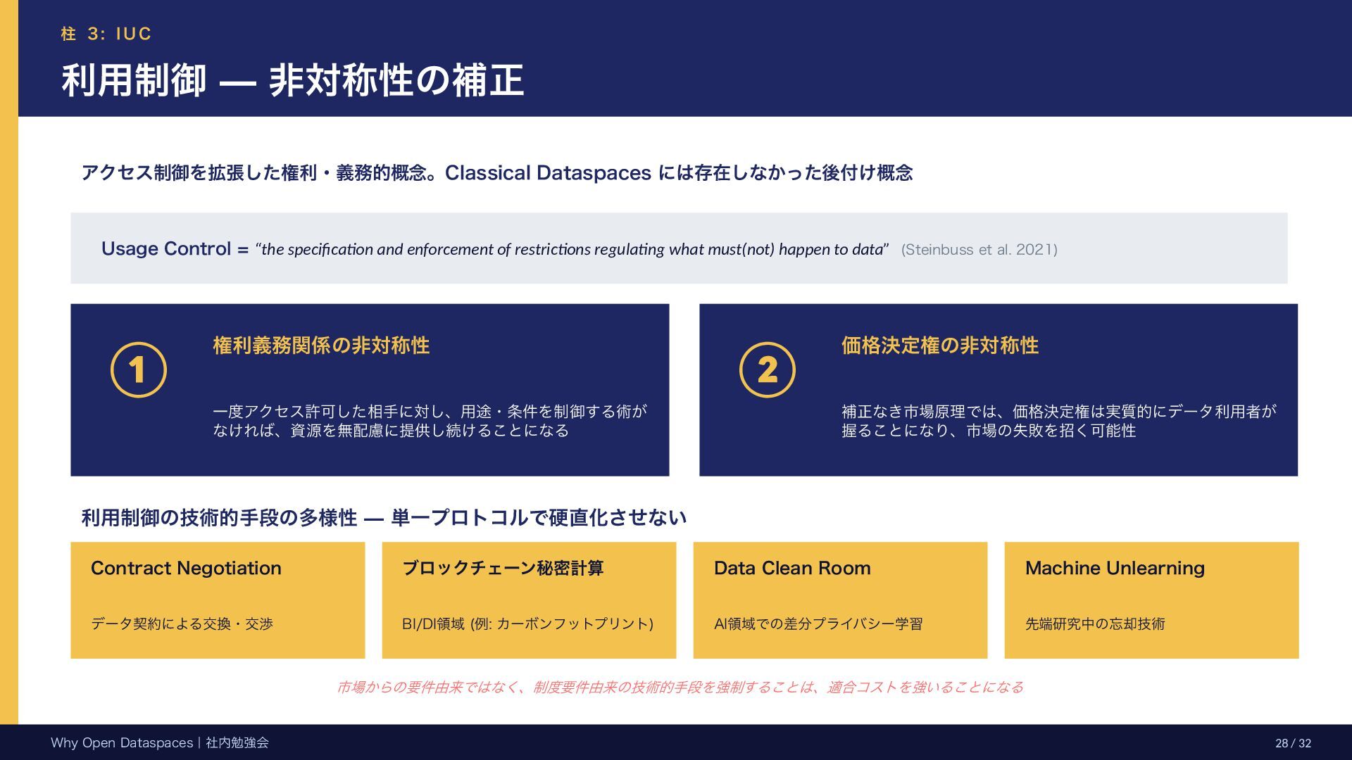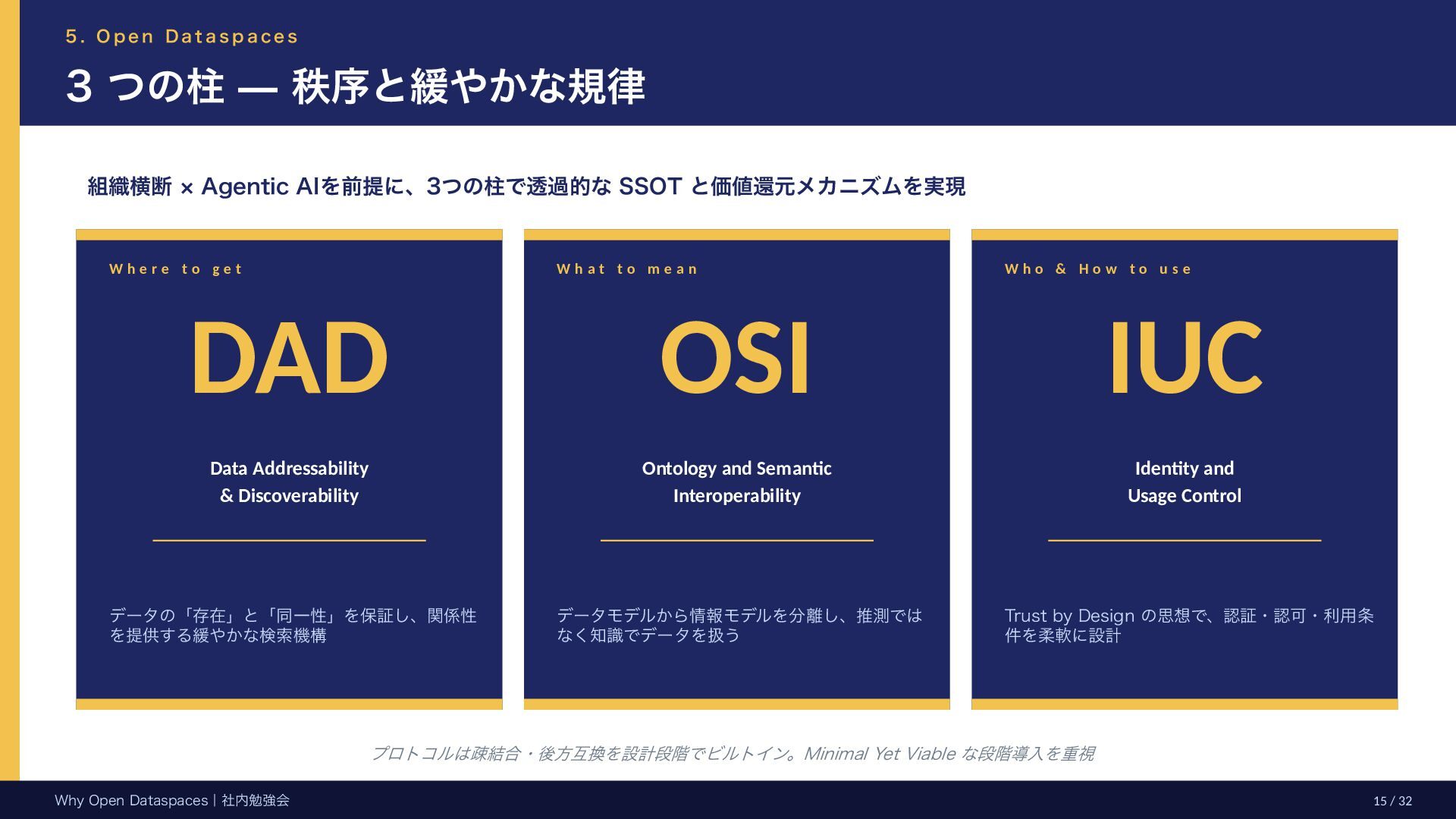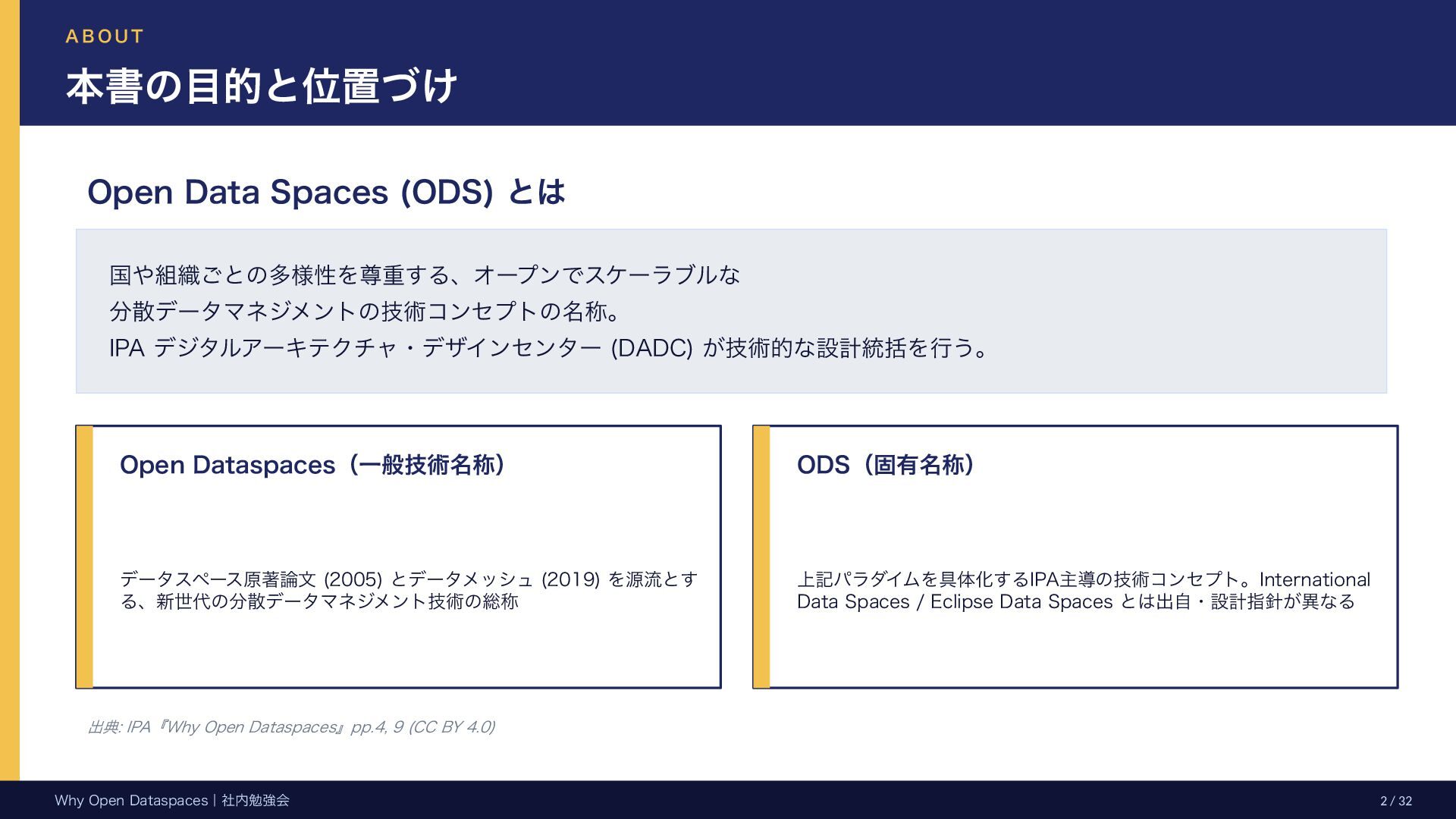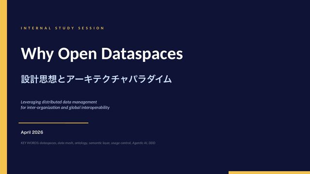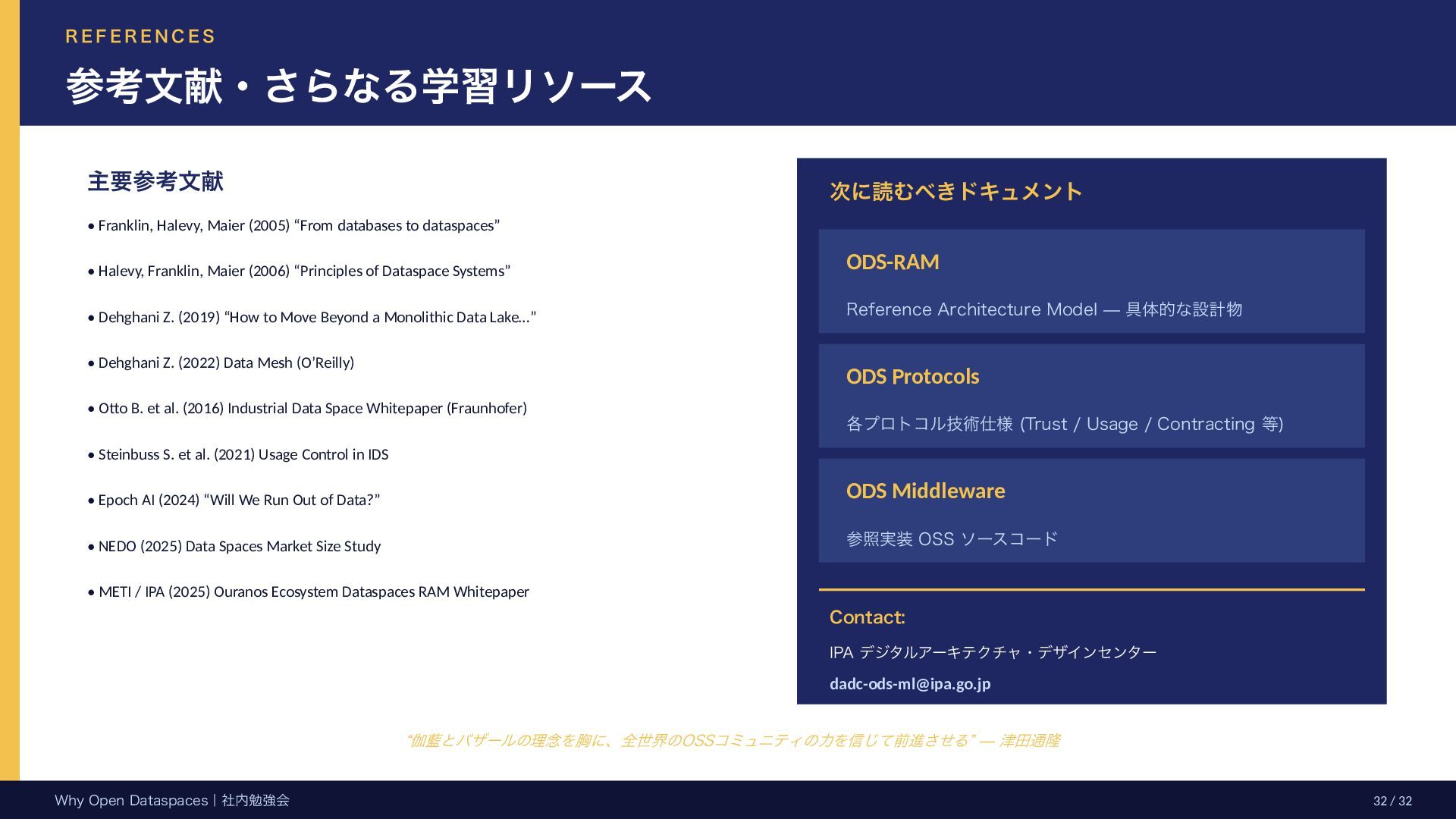 参考文献・さらなる学習リソース 主要参考文献 • Franklin, Halevy, Maier (2005) “From databases to dataspaces” • Halevy, Franklin, Maier (2006) “Principles of Dataspace Systems” • Dehghani Z. (2019) “How to Move Beyond a Monolithic Data Lake…” • Dehghani Z. (2022) Data Mesh (O’Reilly) • Otto B. et al. (2016) Industrial Data Space Whitepaper (Fraunhofer) • Steinbuss S. et al. (2021) Usage Control in IDS • Epoch AI (2024) “Will We Run Out of Data?” • NEDO (2025) Data Spaces Market Size Study • METI / IPA (2025) Ouranos Ecosystem Dataspaces RAM Whitepaper 次に読むべきドキュメント ODS-RAM Reference Architecture Model — 具体的な設計物 ODS Protocols 各プロトコル技術仕様 (Trust / Usage / Contracting 等) ODS Middleware 参照実装 OSS ソースコード Contact: IPA デジタルアーキテクチャ・デザインセンター