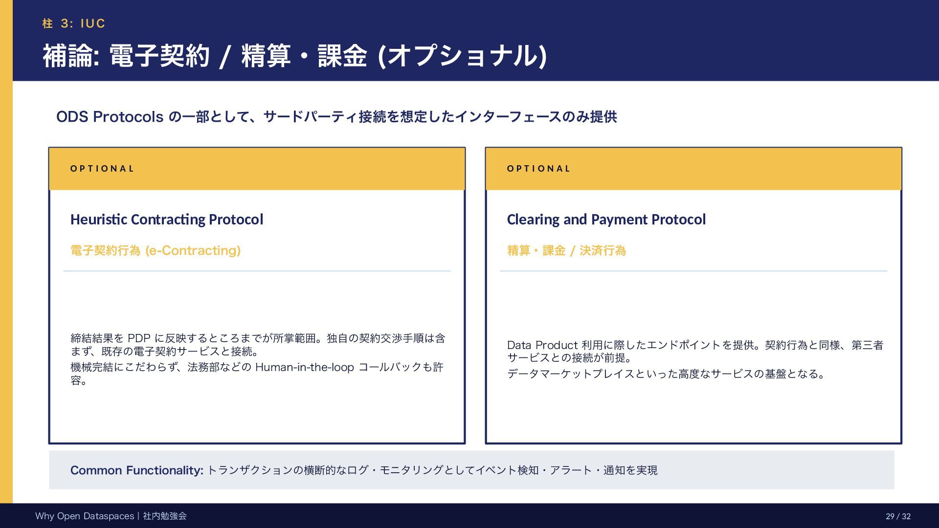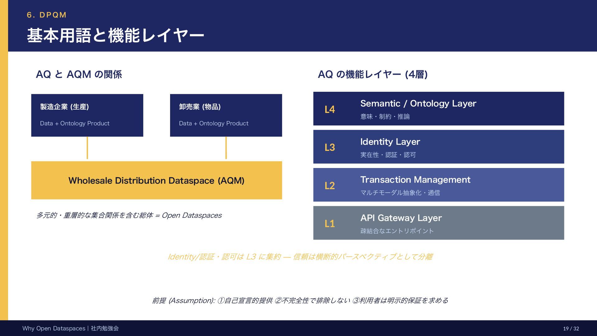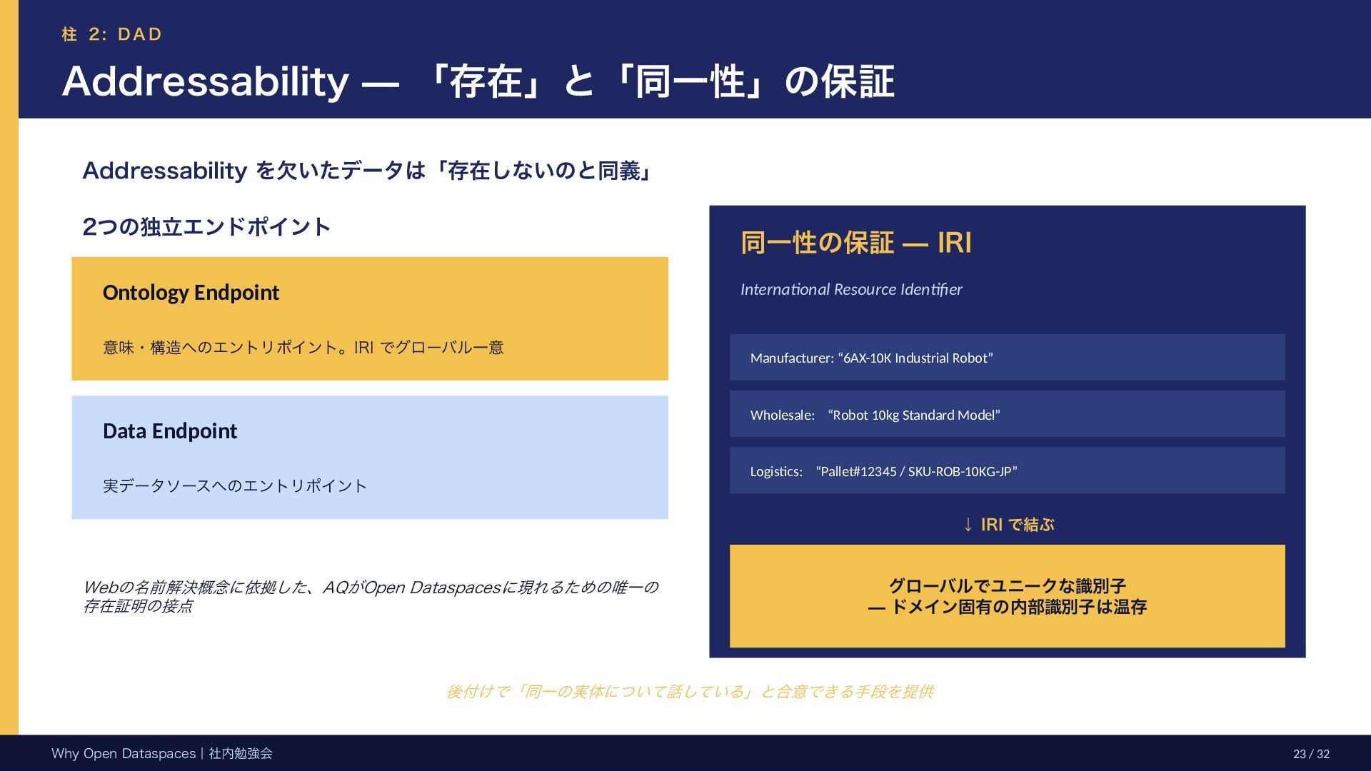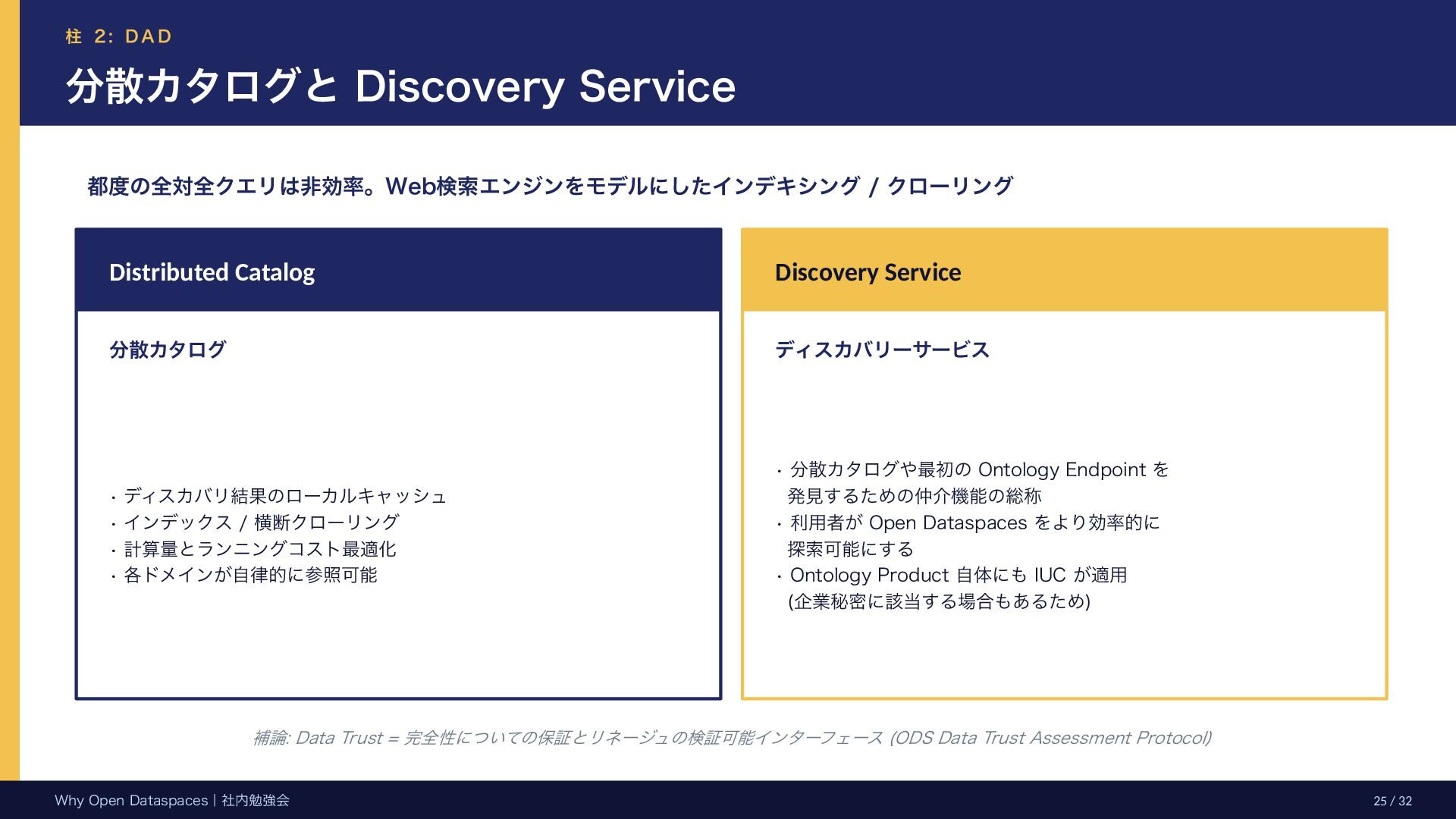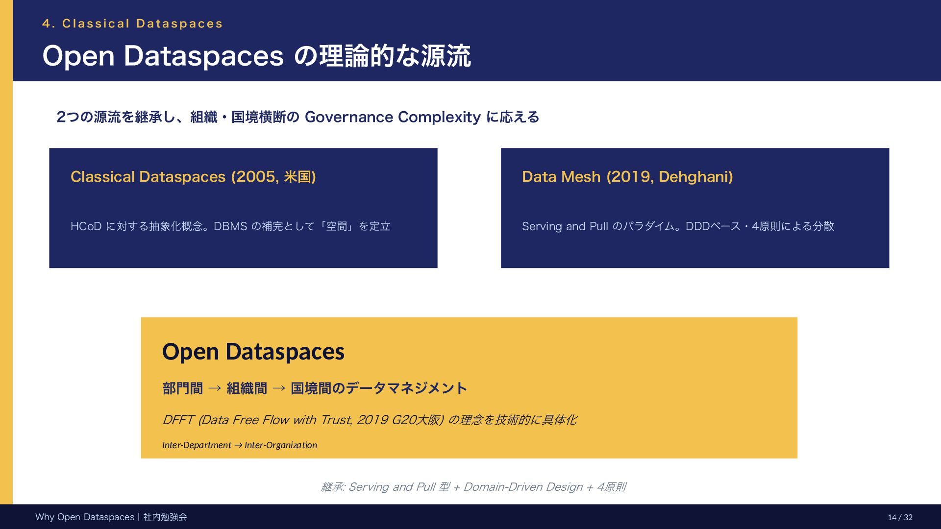 参考文献・さらなる学習リソース 主要参考文献 • Franklin, Halevy, Maier (2005) “From databases to dataspaces” • Halevy, Franklin, Maier (2006) “Principles of Dataspace Systems” • Dehghani Z. (2019) “How to Move Beyond a Monolithic Data Lake…” • Dehghani Z. (2022) Data Mesh (O’Reilly) • Otto B. et al. (2016) Industrial Data Space Whitepaper (Fraunhofer) • Steinbuss S. et al. (2021) Usage Control in IDS • Epoch AI (2024) “Will We Run Out of Data?” • NEDO (2025) Data Spaces Market Size Study • METI / IPA (2025) Ouranos Ecosystem Dataspaces RAM Whitepaper 次に読むべきドキュメント ODS-RAM Reference Architecture Model — 具体的な設計物 ODS Protocols 各プロトコル技術仕様 (Trust / Usage / Contracting 等) ODS Middleware 参照実装 OSS ソースコード Contact: IPA デジタルアーキテクチャ・デザインセンター