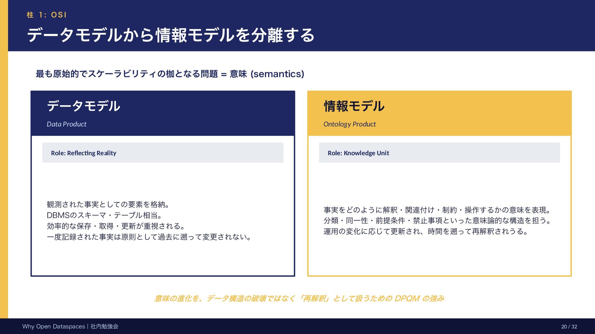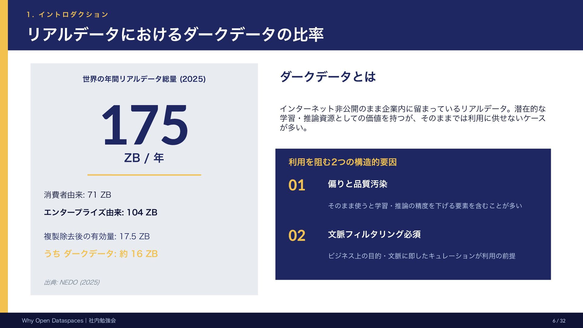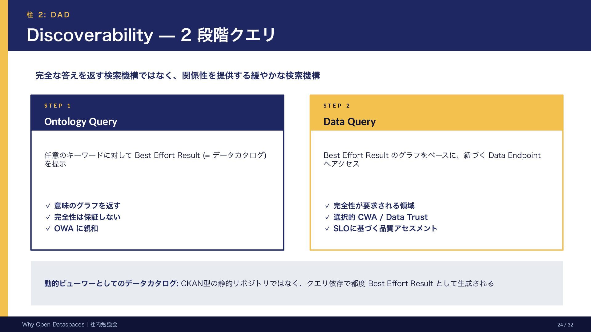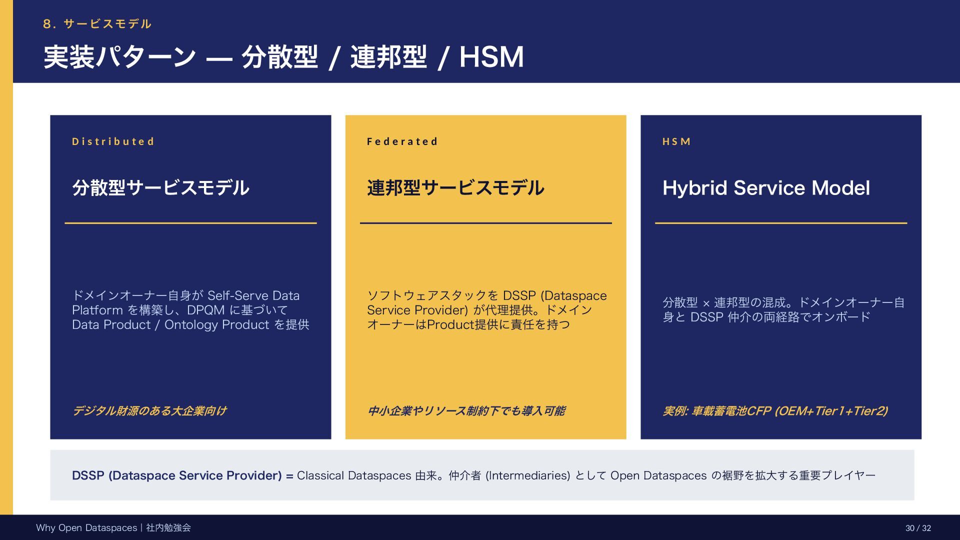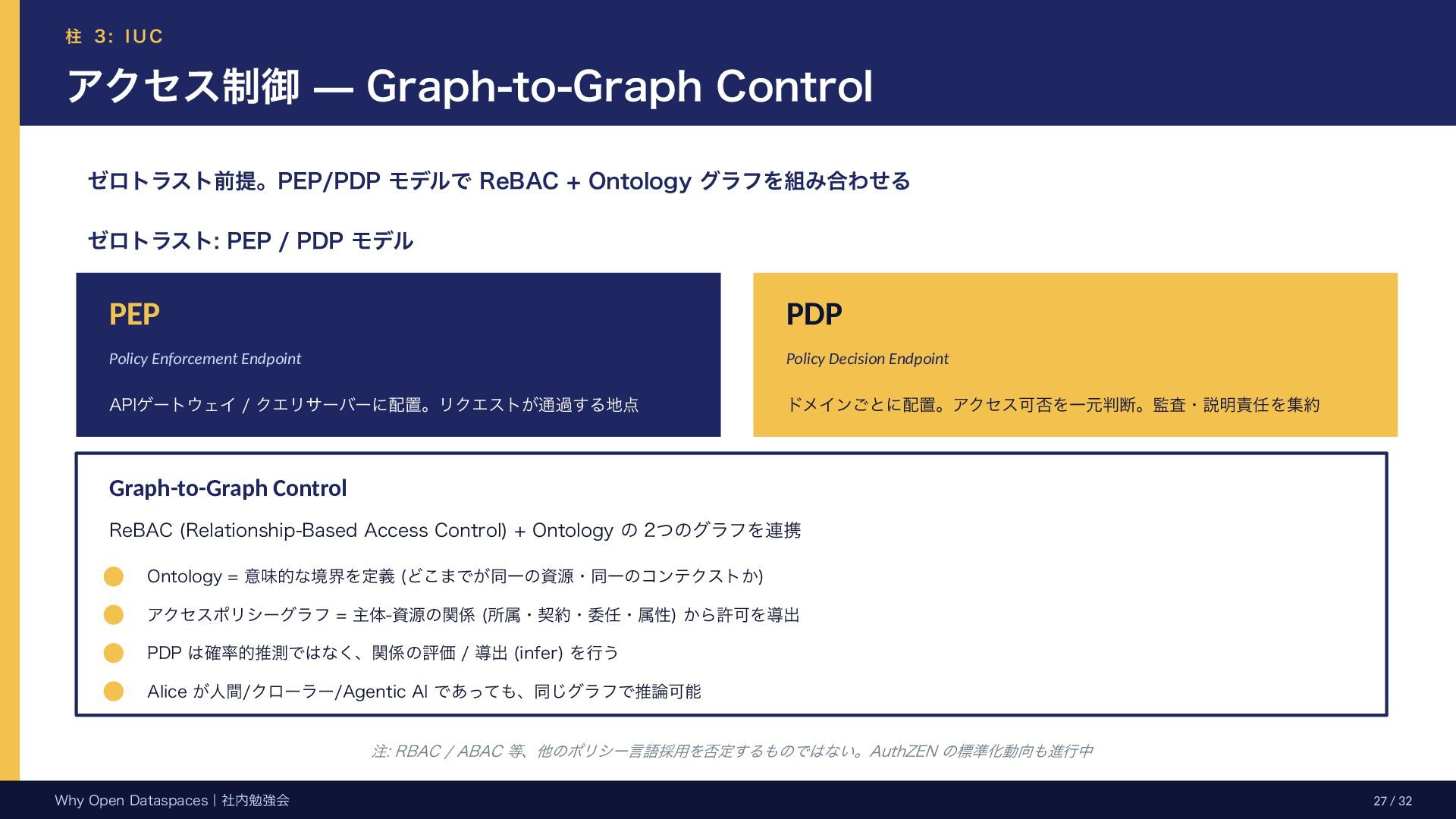 参考文献・さらなる学習リソース 主要参考文献 • Franklin, Halevy, Maier (2005) “From databases to dataspaces” • Halevy, Franklin, Maier (2006) “Principles of Dataspace Systems” • Dehghani Z. (2019) “How to Move Beyond a Monolithic Data Lake…” • Dehghani Z. (2022) Data Mesh (O’Reilly) • Otto B. et al. (2016) Industrial Data Space Whitepaper (Fraunhofer) • Steinbuss S. et al. (2021) Usage Control in IDS • Epoch AI (2024) “Will We Run Out of Data?” • NEDO (2025) Data Spaces Market Size Study • METI / IPA (2025) Ouranos Ecosystem Dataspaces RAM Whitepaper 次に読むべきドキュメント ODS-RAM Reference Architecture Model — 具体的な設計物 ODS Protocols 各プロトコル技術仕様 (Trust / Usage / Contracting 等) ODS Middleware 参照実装 OSS ソースコード Contact: IPA デジタルアーキテクチャ・デザインセンター