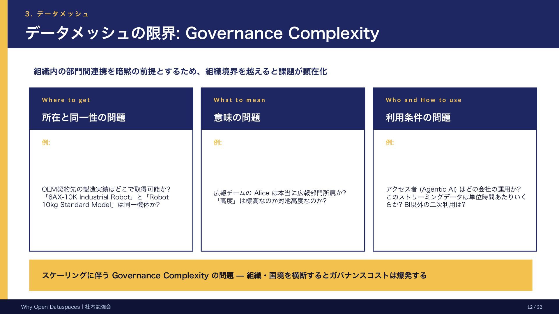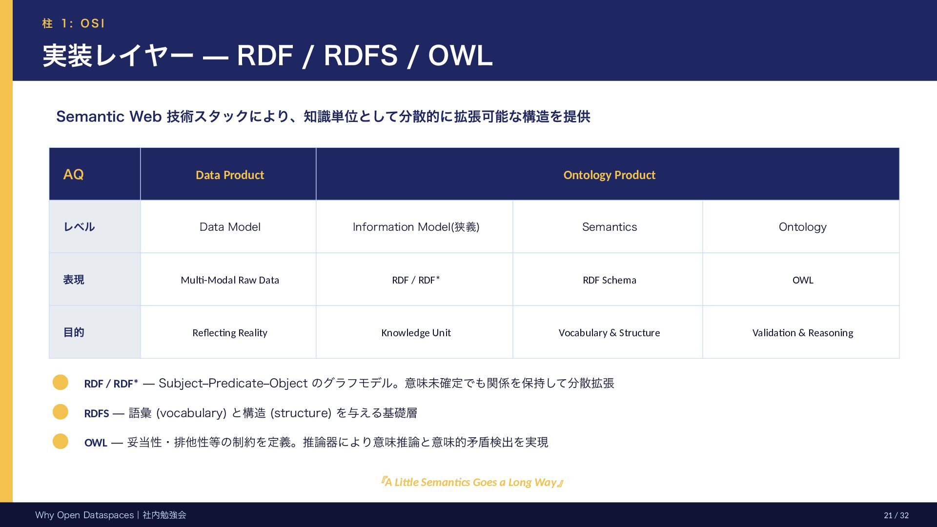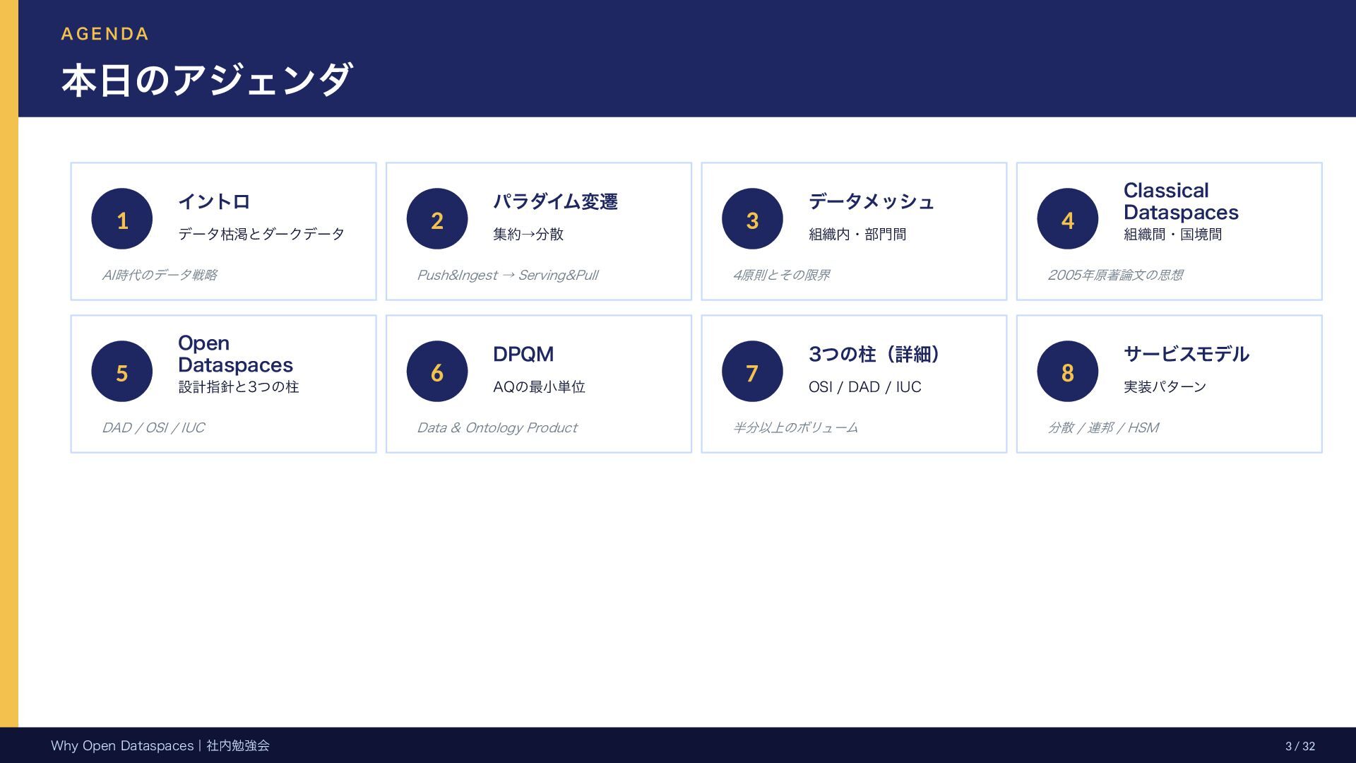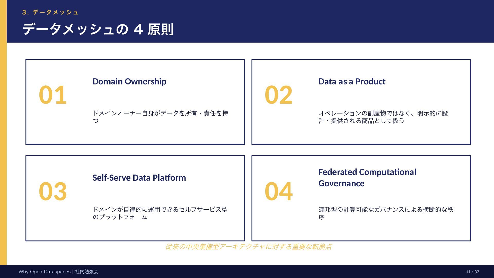 参考文献・さらなる学習リソース 主要参考文献 • Franklin, Halevy, Maier (2005) “From databases to dataspaces” • Halevy, Franklin, Maier (2006) “Principles of Dataspace Systems” • Dehghani Z. (2019) “How to Move Beyond a Monolithic Data Lake…” • Dehghani Z. (2022) Data Mesh (O’Reilly) • Otto B. et al. (2016) Industrial Data Space Whitepaper (Fraunhofer) • Steinbuss S. et al. (2021) Usage Control in IDS • Epoch AI (2024) “Will We Run Out of Data?” • NEDO (2025) Data Spaces Market Size Study • METI / IPA (2025) Ouranos Ecosystem Dataspaces RAM Whitepaper 次に読むべきドキュメント ODS-RAM Reference Architecture Model — 具体的な設計物 ODS Protocols 各プロトコル技術仕様 (Trust / Usage / Contracting 等) ODS Middleware 参照実装 OSS ソースコード Contact: IPA デジタルアーキテクチャ・デザインセンター