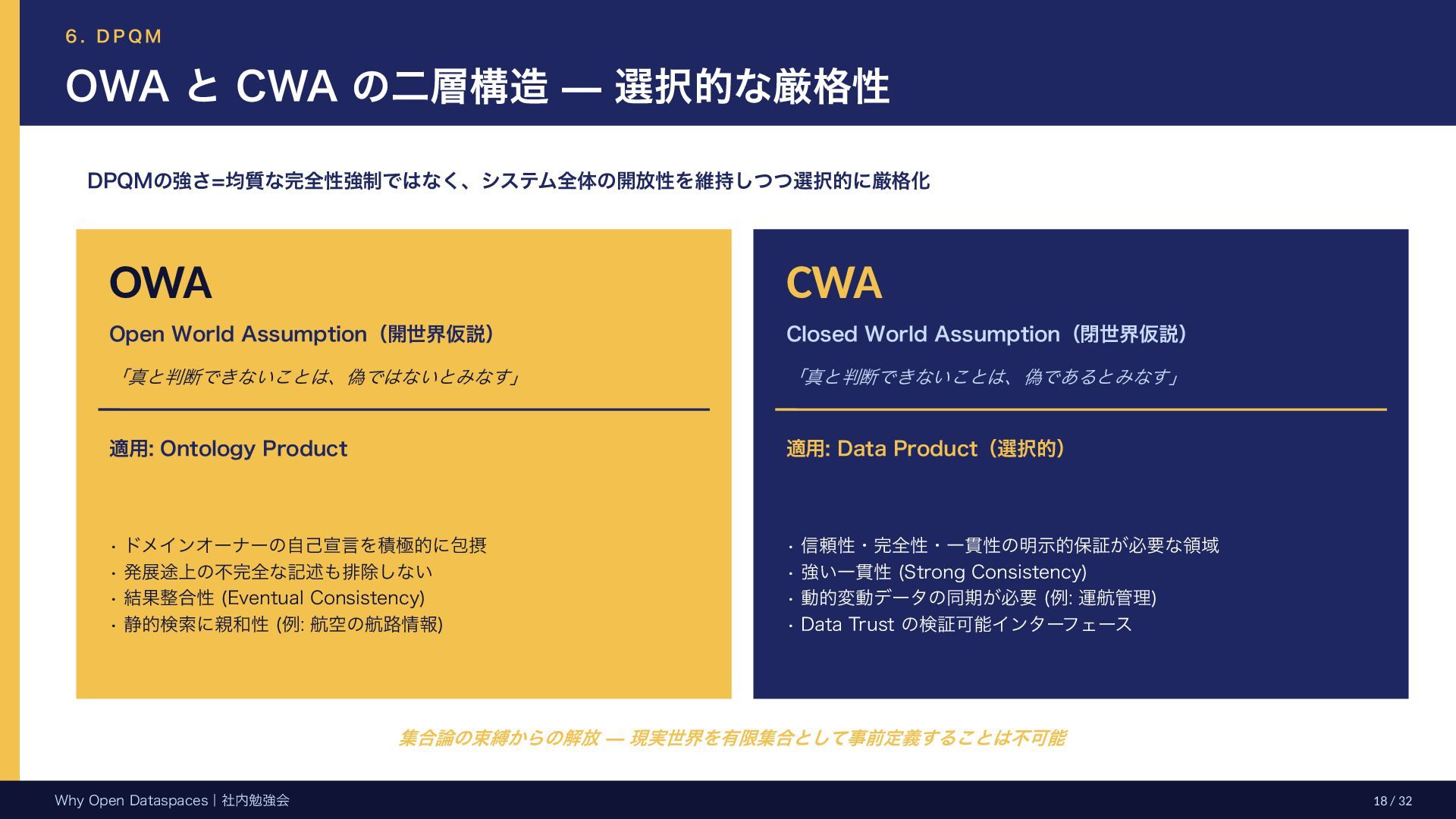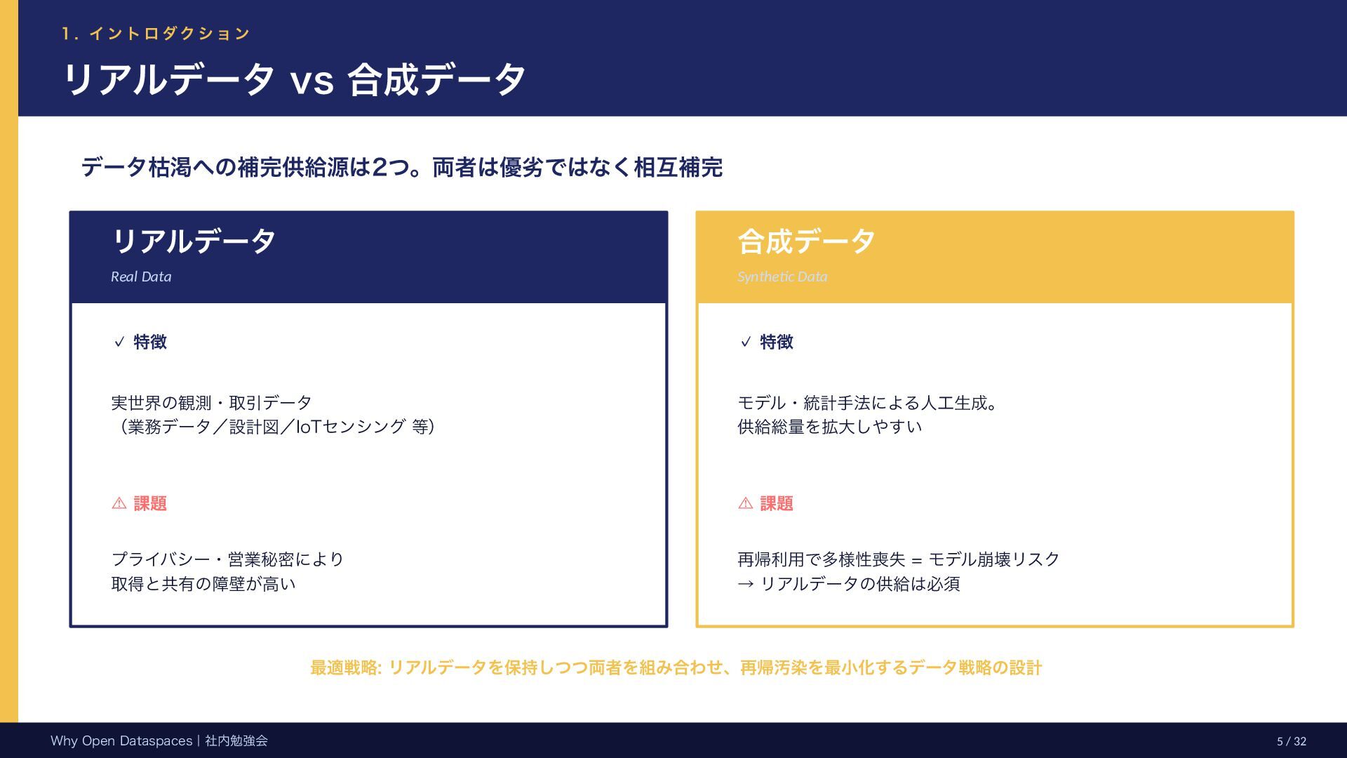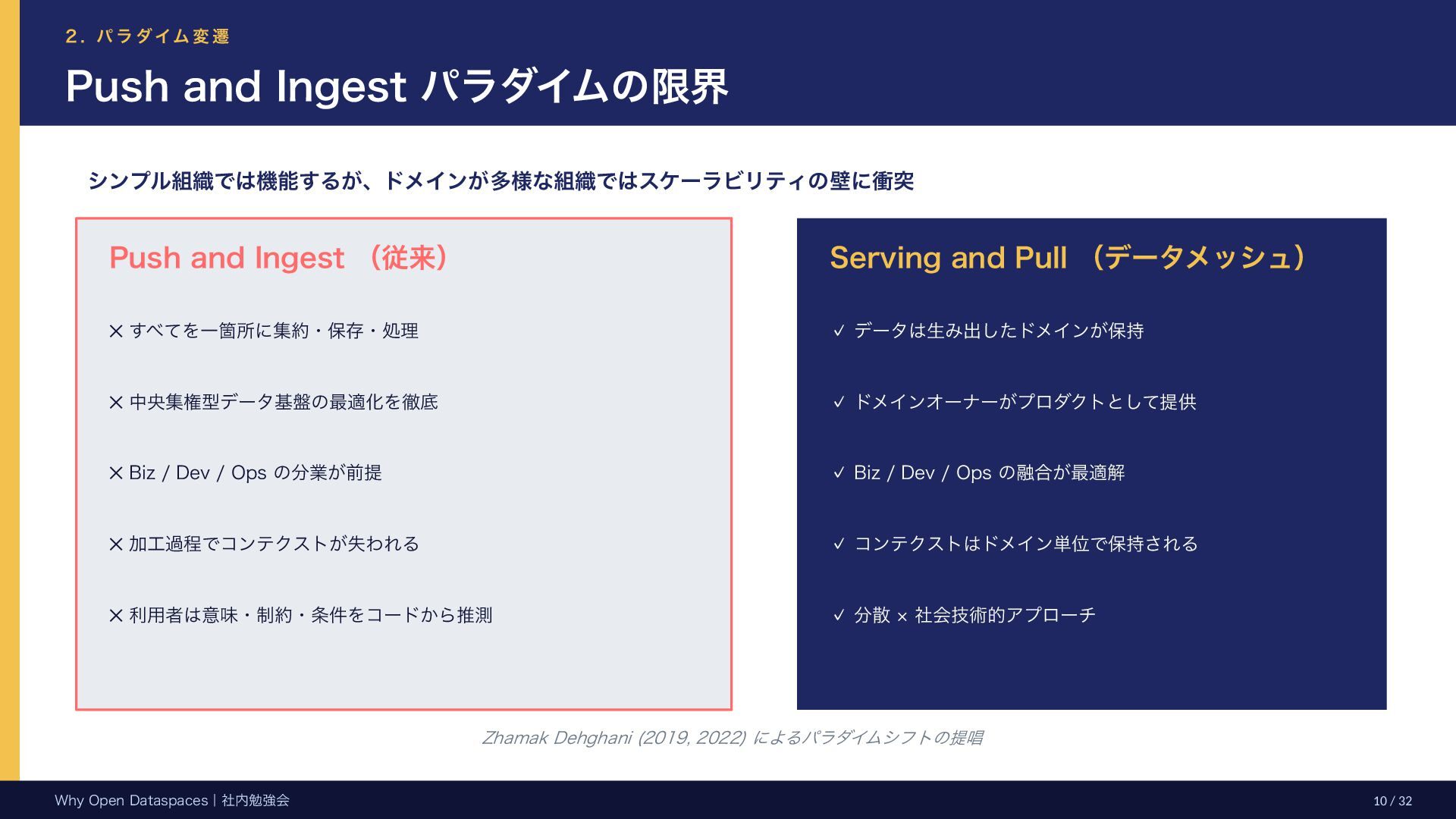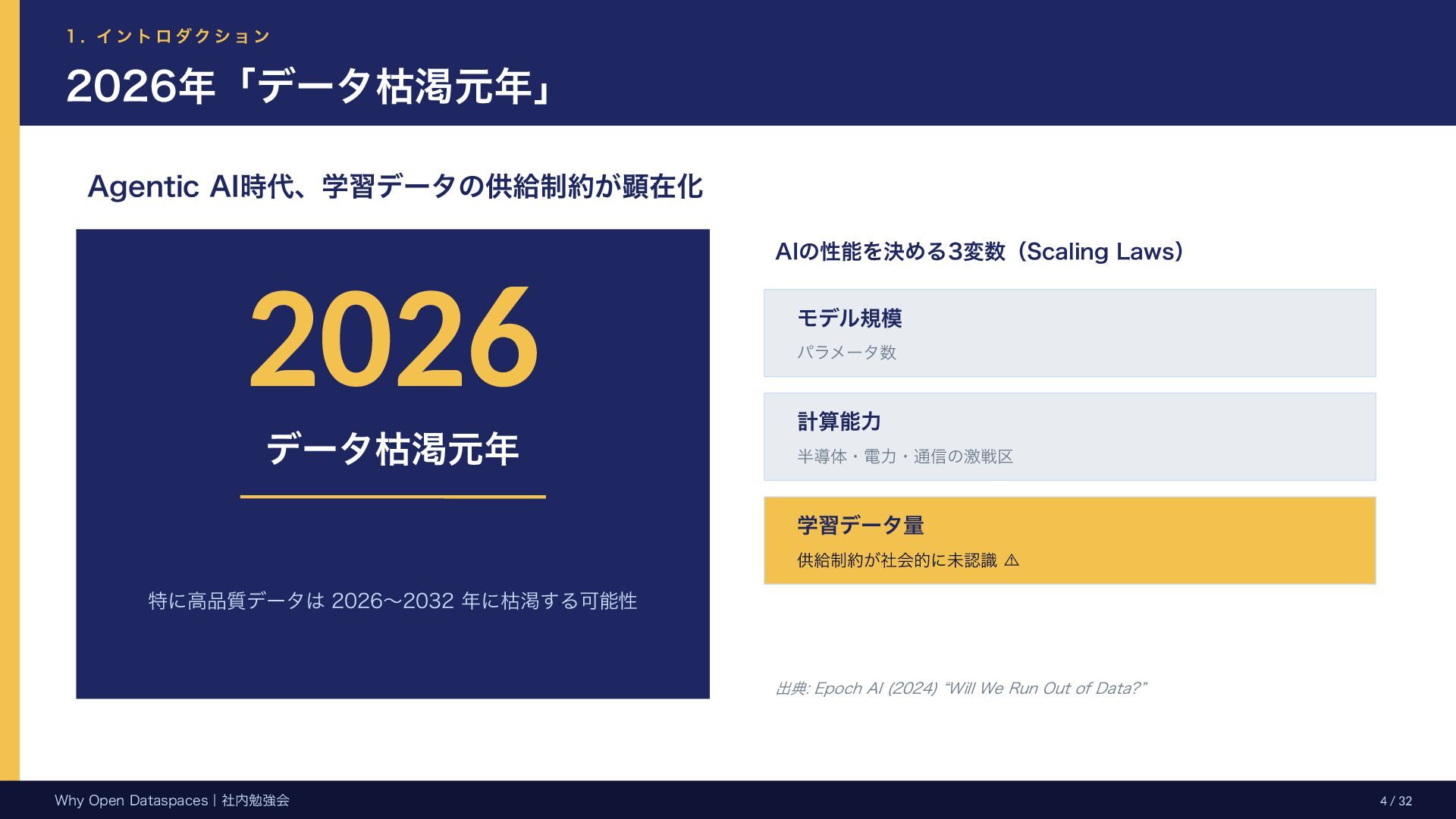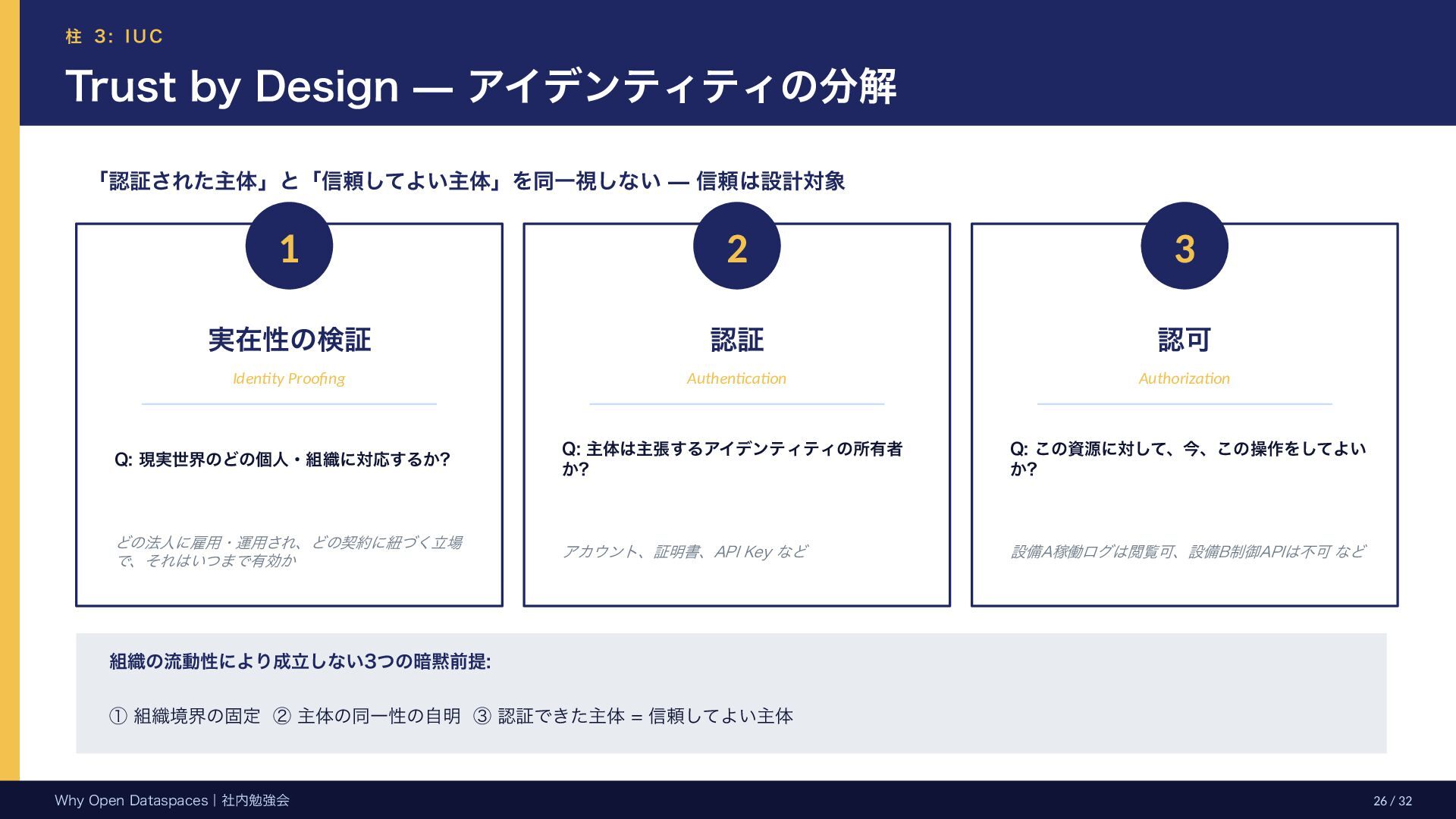 参考文献・さらなる学習リソース 主要参考文献 • Franklin, Halevy, Maier (2005) “From databases to dataspaces” • Halevy, Franklin, Maier (2006) “Principles of Dataspace Systems” • Dehghani Z. (2019) “How to Move Beyond a Monolithic Data Lake…” • Dehghani Z. (2022) Data Mesh (O’Reilly) • Otto B. et al. (2016) Industrial Data Space Whitepaper (Fraunhofer) • Steinbuss S. et al. (2021) Usage Control in IDS • Epoch AI (2024) “Will We Run Out of Data?” • NEDO (2025) Data Spaces Market Size Study • METI / IPA (2025) Ouranos Ecosystem Dataspaces RAM Whitepaper 次に読むべきドキュメント ODS-RAM Reference Architecture Model — 具体的な設計物 ODS Protocols 各プロトコル技術仕様 (Trust / Usage / Contracting 等) ODS Middleware 参照実装 OSS ソースコード Contact: IPA デジタルアーキテクチャ・デザインセンター