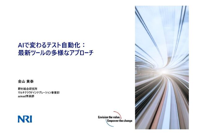 2024/09/10 AI無しでは語れないテストツール最前線 (AI Test Lab vol.2) https://shiftevolve.connpass.com/event/328179/ 株式会社野村総合研究所 マルチクラウドインテグレーション事業本部 aslead事業部 シニアアカウントマネージャ 金山 貴泰
