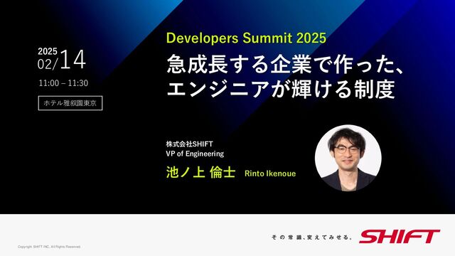 Engineering Developers Summit 2025 池ノ上 倫士 急成長する企業で作った、 エンジニアが輝ける制度 02/ 14 11:00 – 11:30 ホテル雅叙園東京 Rinto Ikenoue